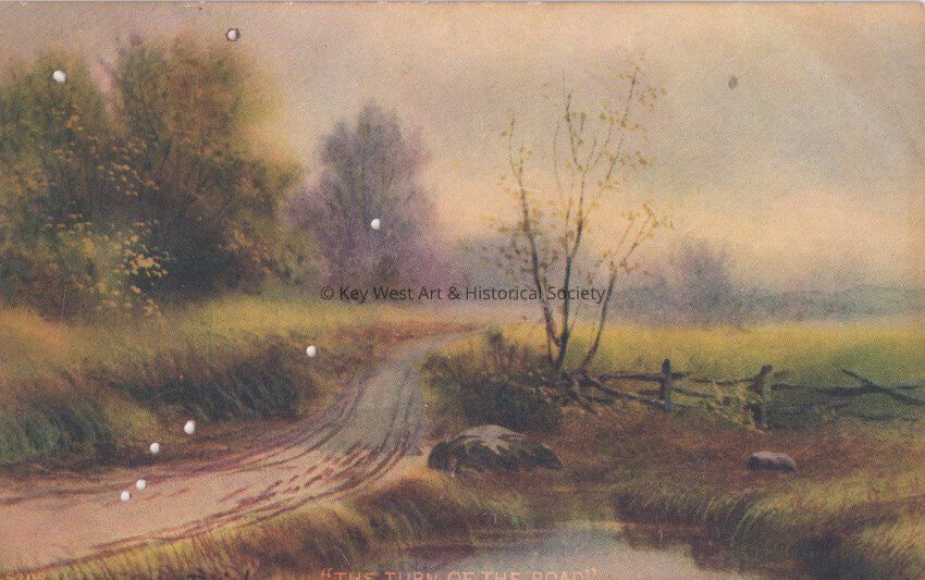Postcard depicting a muddy road curving through a field. The caption reads, ‘The Turn of the Road’.Collection