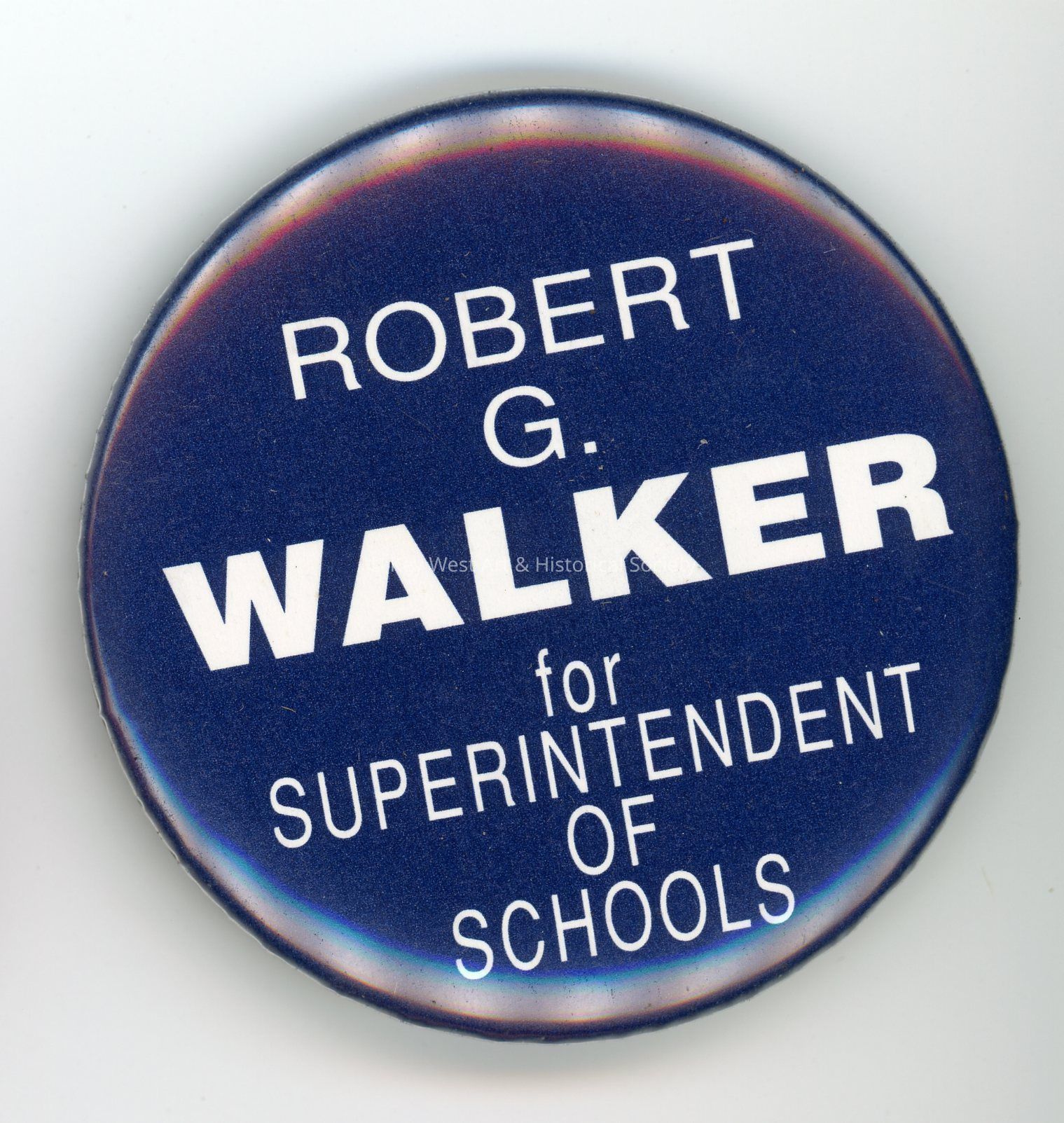 Pinback button with a safety pin fastener. The button has a blue base with white text reading 'Robert G. Walker for Superintendent Of Schools.'