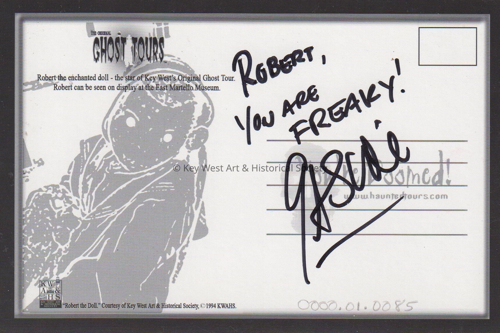 Postcard depicting Robert the Doll. The caption reads, 'Robert the Doll, the original Ghost Tours'. The description on the verso reads, 'Ghost Tours, Robert the enchanted doll - the star of Key West's Original Ghost Tour. Robert can be seen on display at the East Martello Museum. You're Doomed, www.hauntedtours.com'. The message on the verso reads, 'Robert, You are FREAKY! ___'.Collection