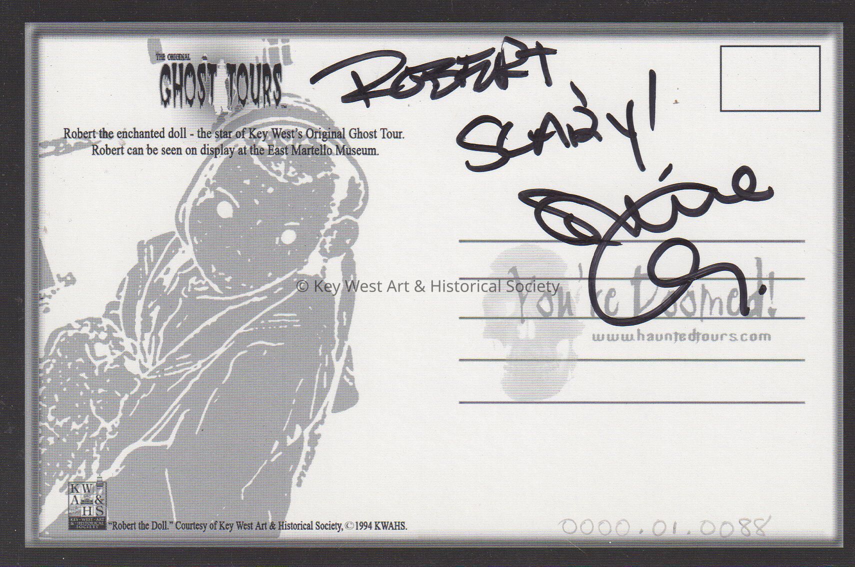 Postcard depicting Robert the Doll. The caption reads, 'Robert the Doll, the original Ghost Tours'. The description on the verso reads, 'Ghost Tours, Robert the enchanted doll - the star of Key West's Original Ghost Tour. Robert can be seen on display at the East Martello Museum. You're Doomed, www.hauntedtours.com'. The message on the verso reads, 'Robert, Scary! ___'.Collection