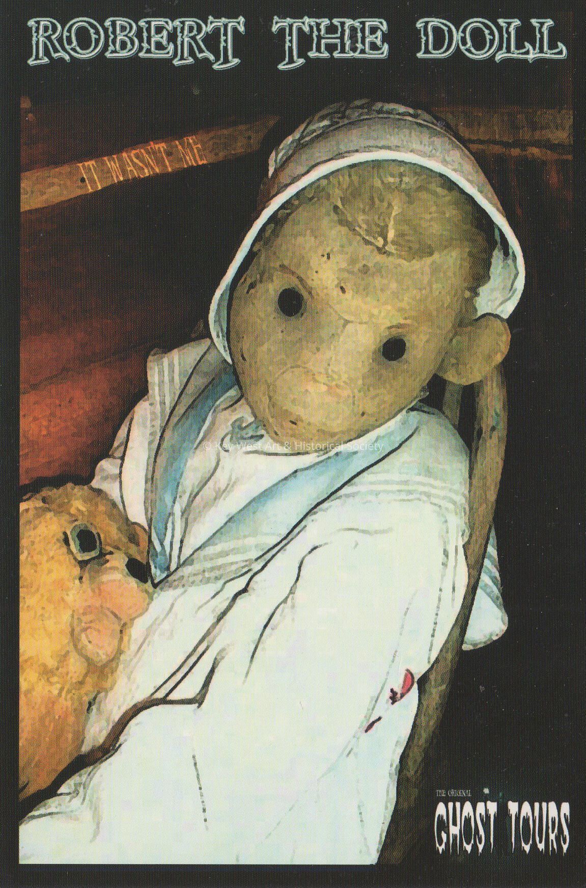 Postcard depicting Robert the Doll. The caption reads, 'Robert the Doll, the original Ghost Tours'. The description on the verso reads, 'Ghost Tours, Robert the enchanted doll - the star of Key West's Original Ghost Tour. Robert can be seen on display at the East Martello Museum. You're Doomed, www.hauntedtours.com'.Collection