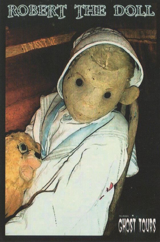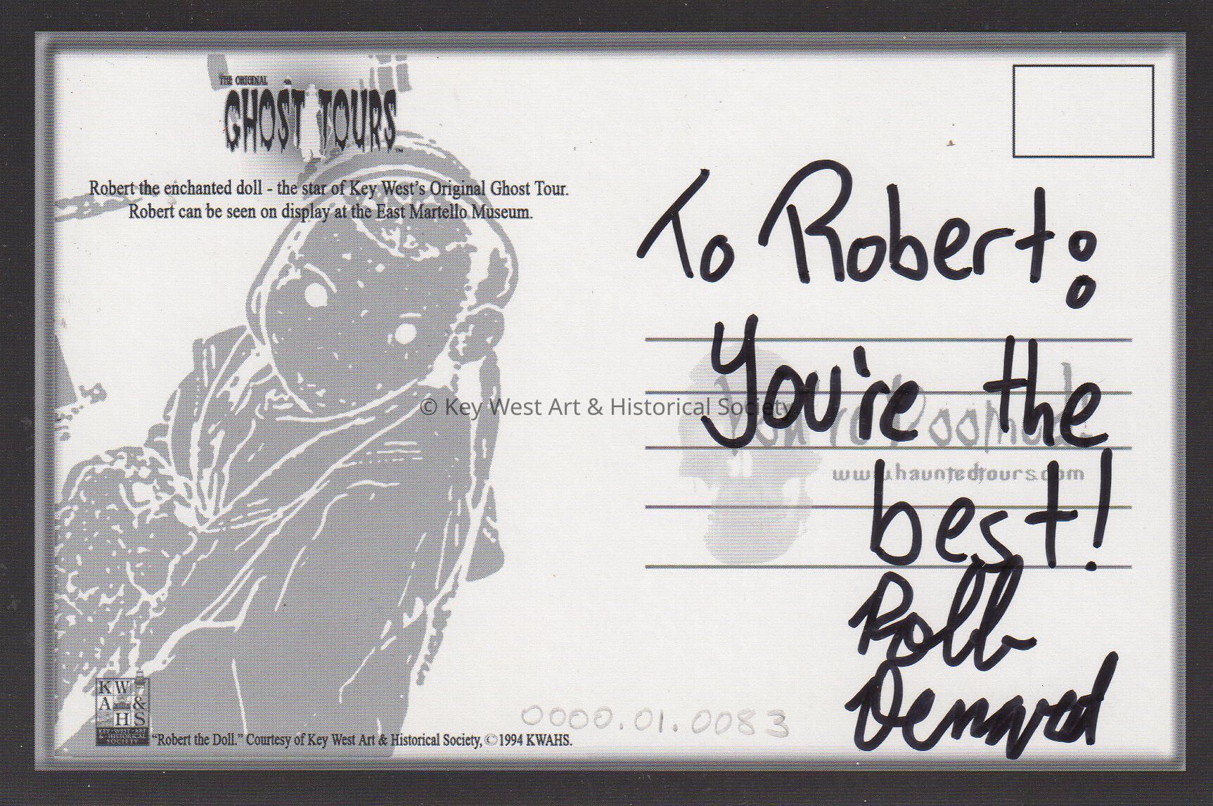 Postcard depicting Robert the Doll. The caption reads, 'Robert the Doll, the original Ghost Tours'. The description on the verso reads, 'Ghost Tours, Robert the enchanted doll - the star of Key West's Original Ghost Tour. Robert can be seen on display at the East Martello Museum. You're Doomed, www.hauntedtours.com'. The message on the verso reads, 'To Robert: You're the best! Robb ___'.Collection