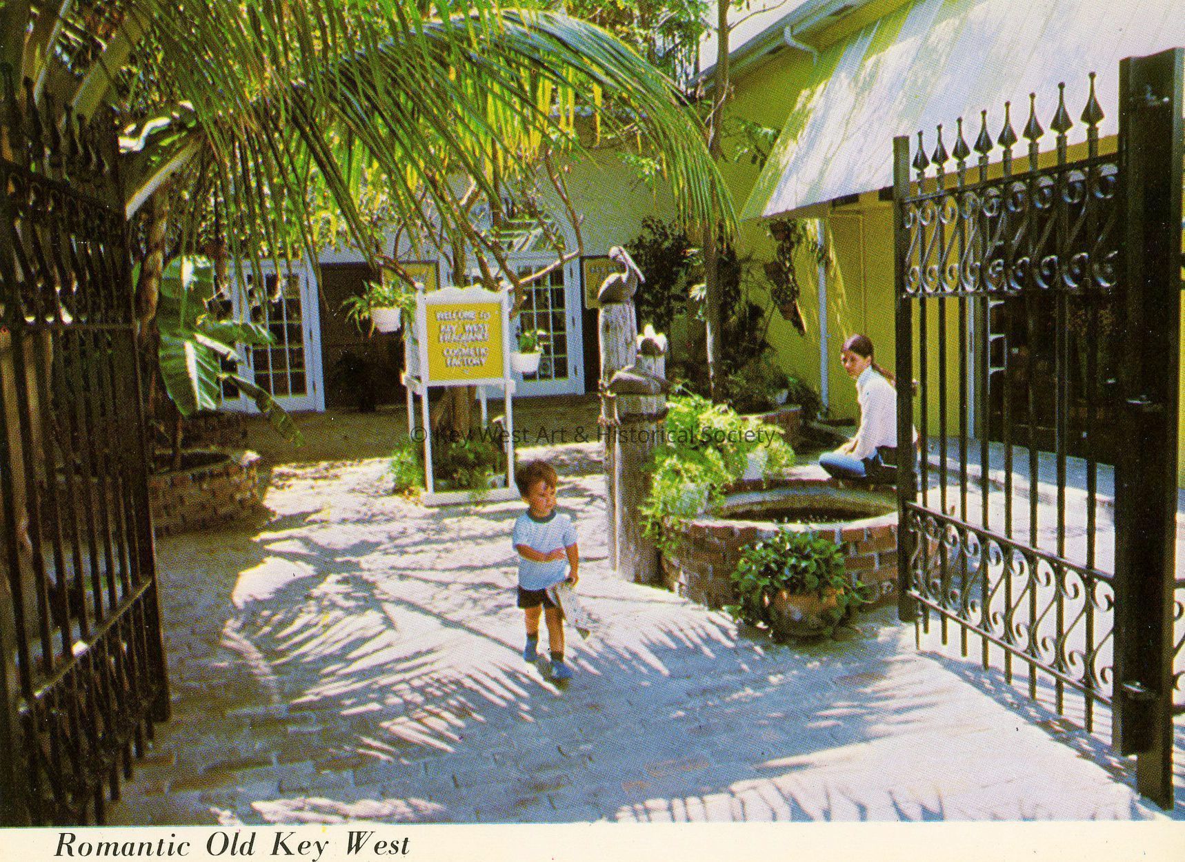 Postcard depicting the Key West Fragrance & Cosmetic Factory at 524 Front Street. Notation on verso, 'Quaint, wrought iron entrance gate to this interesting factory is enjoyed by tourists. It specializes in lotions made from the aloe plant, which grows in Key West, and has wonderful curative powers for skin care and treatment of sunburn. Tourists are invited to watch the laboratory at work.'Subject Place