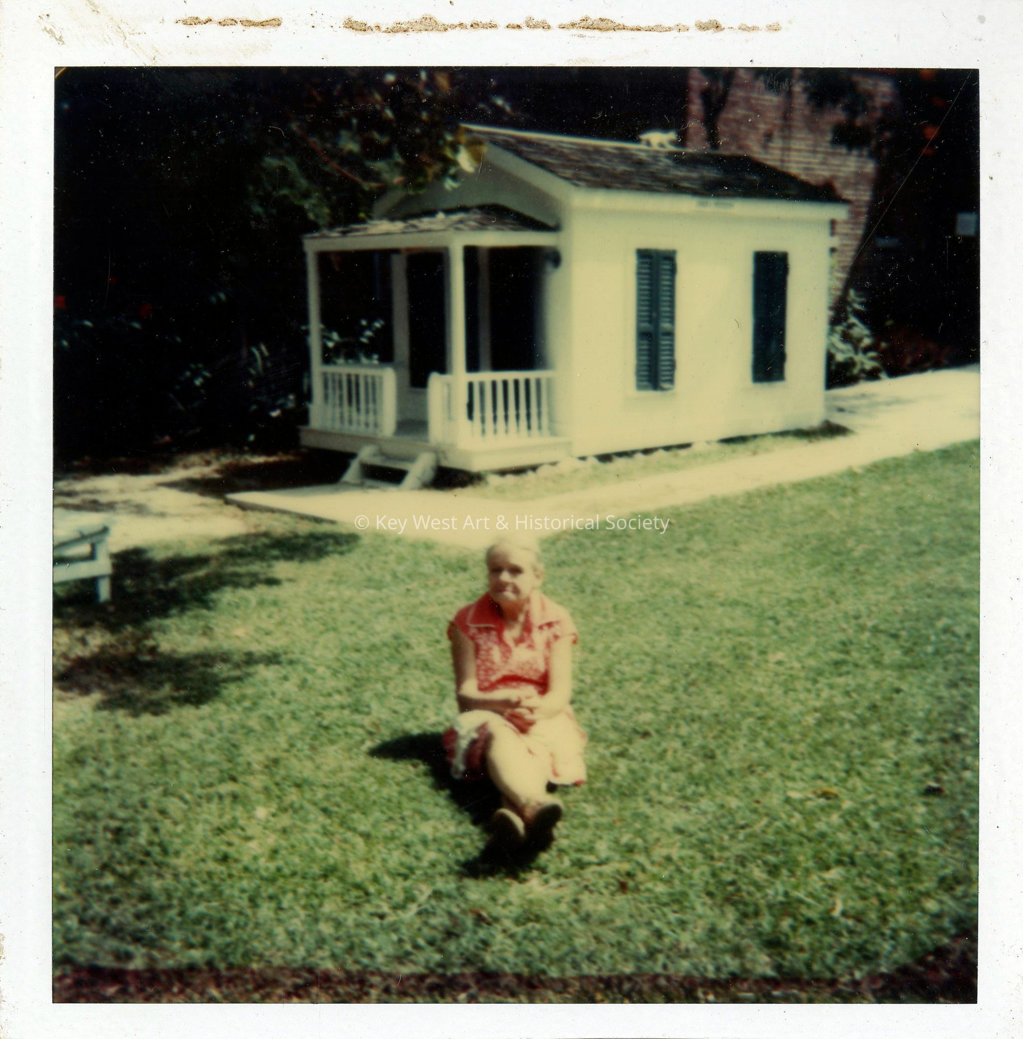 Color Polaroid photograph of Rose Williams sitting on the grass outside the Wolkowsky dollhouse at Fort East Martello Museum.