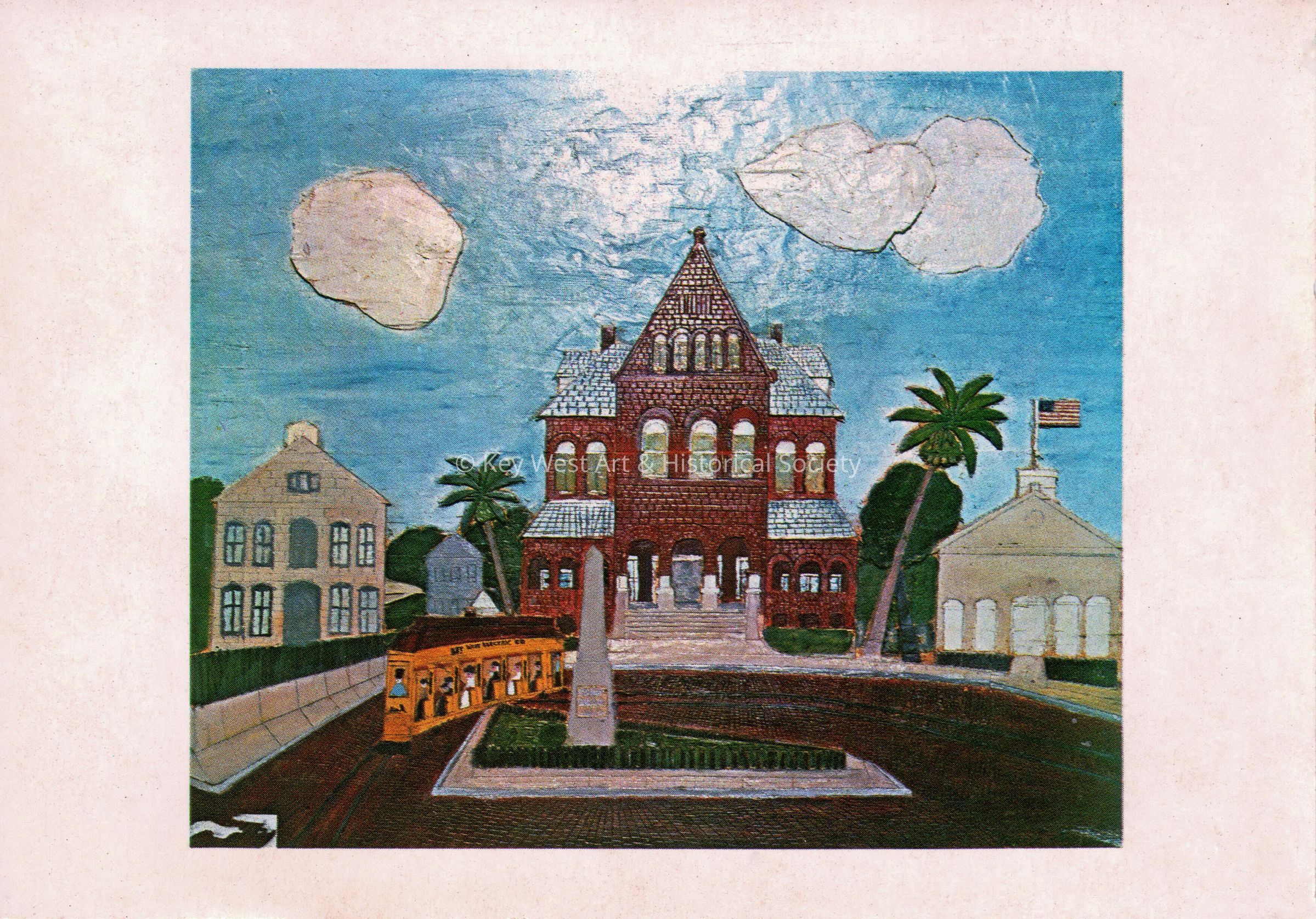 Postcard depicting a Mario Sanchez woodcarving of a trolley in front of the Custom House, Key West, Florida. The description on the verso reads, 'Mario Sanchez. "Round the Bend" - 1960 - Painted Woodcarving. This carving portrays a fine example of 19th century brick work in Key West. The building, built in 1891, was formerly the U.S. Post Office and Customs House, now located on the Naval Base (1965). It houses the Navy Industrial Relations Offices and is lovingly called "Old 91". Building on right, flying U.S. flag, was and still is U.S. Coast Guard Headquarters. Building on left, Number 48, was formerly Navy Shipping Department and is now Supply Storehouse. Monument in center of triangular area known as Clinton Square is in honor of the men from Key West Station who lost their lives during the Civil War. The street was bricked, and the street car is one of the Key West Electric Company's. This area of Key West has always been of particular interest to Mario Sanchez, Key West born primitive woodcarver and painter. His grandfather owned a coffee shop at left corner, and his father, a "lector" or "Reader" in the Gato and other cigar factories here, was born on the corner opposite Audubon House. Mario himself, at one time, was the shipping clerk in Building 48. Collection “El Kiosko”, Key West, Florida.’Subject Place