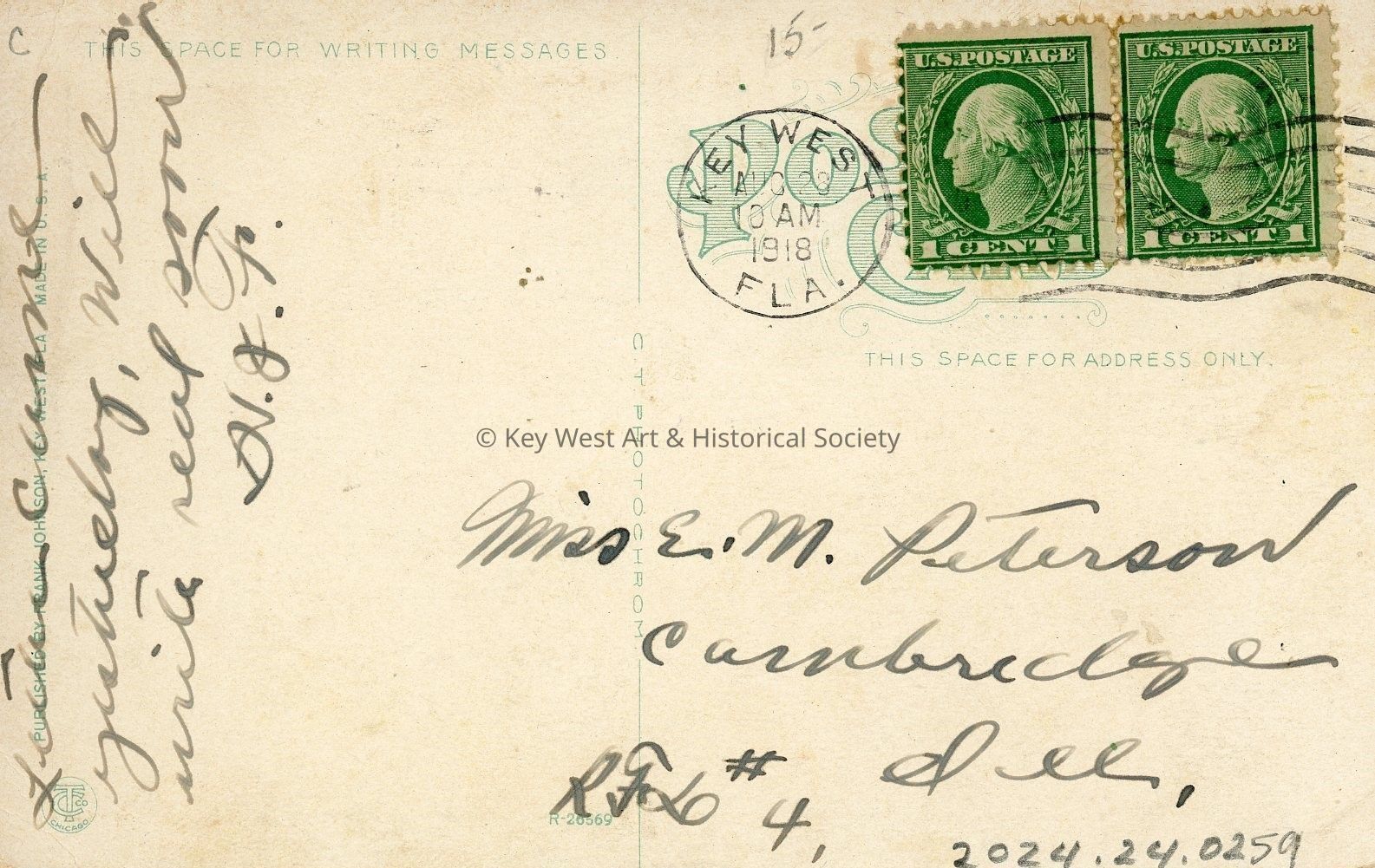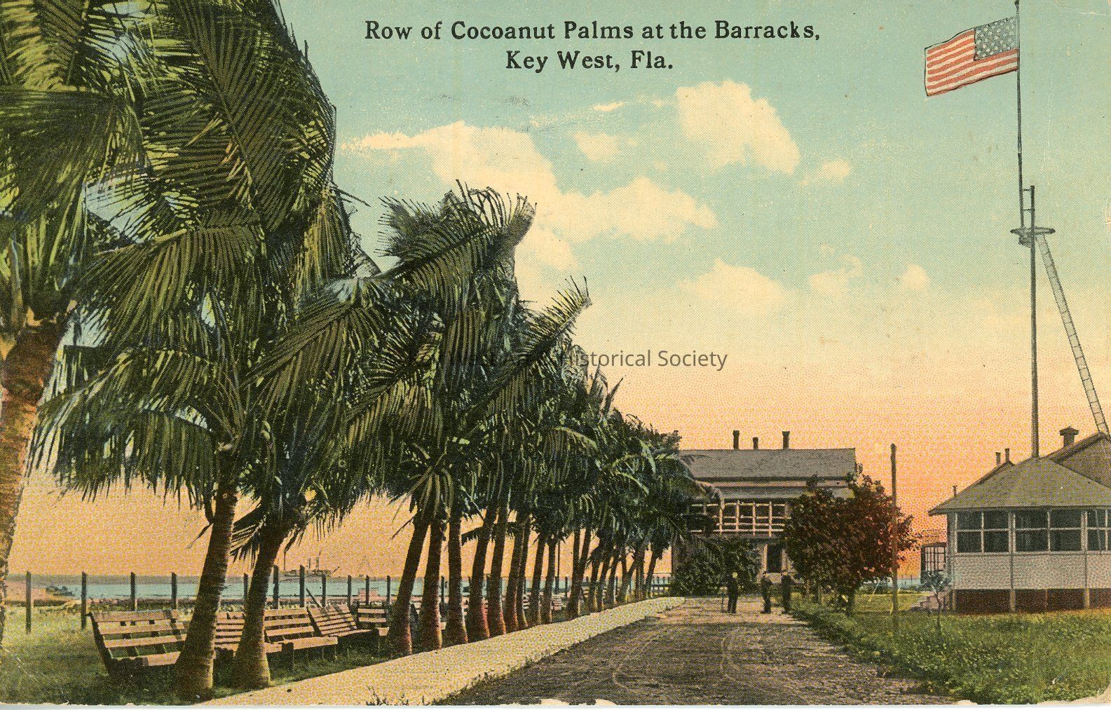Postcard depicting a row of coconut palms at the Barracks, Key West, Fla.Subject Place