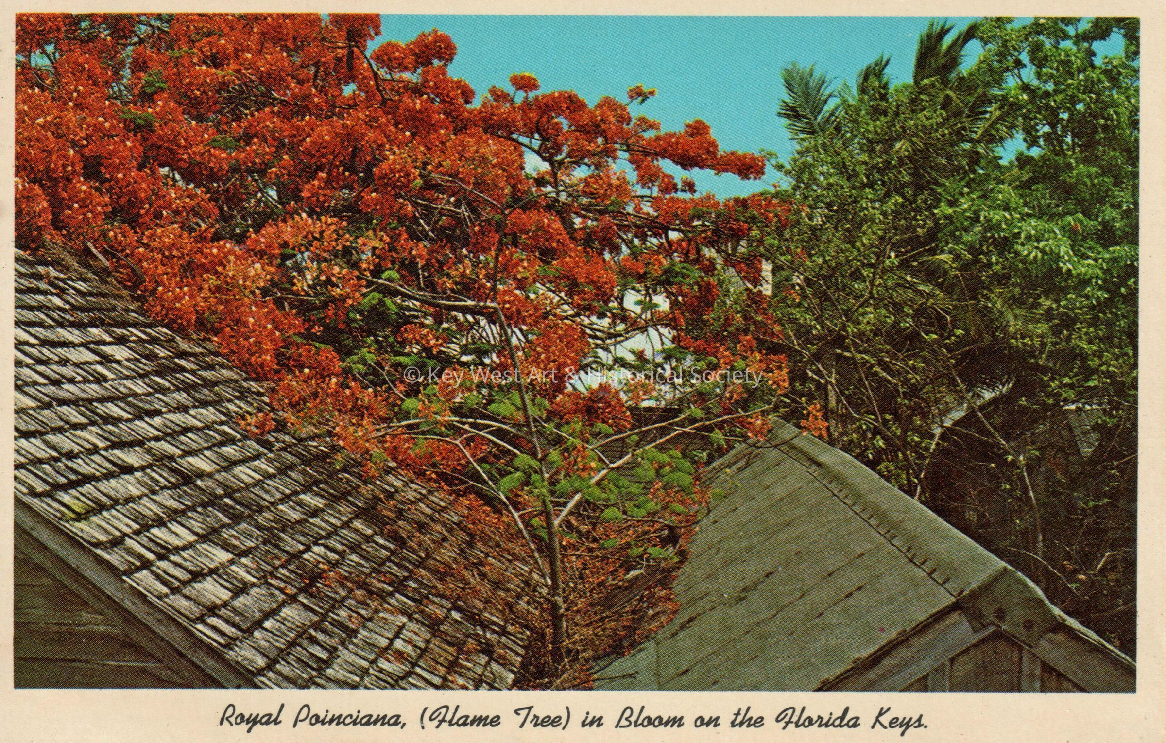 Postcard depicting a flowering tree above a saw-tooth roof. The caption reads, ‘Royal Poinciana (Flame Tree) in bloom on the Florida Keys’.Collection