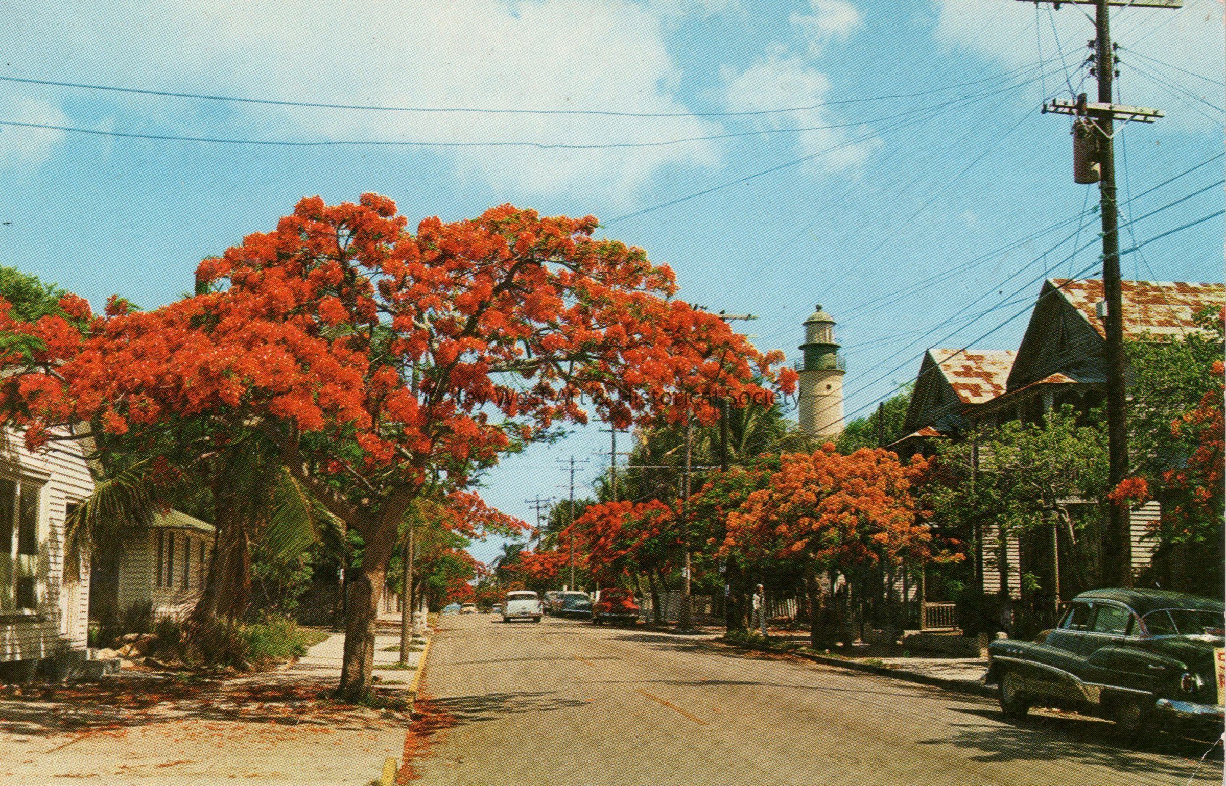 Postcard depicting houses, cars, and flowering trees near a lighthouse. The description on the verso reads, 'Royal Poinciana Trees lined along Simonton [Whitehead] Street in Key West, Florida, with the Lighthouse in the background.'Subject Place