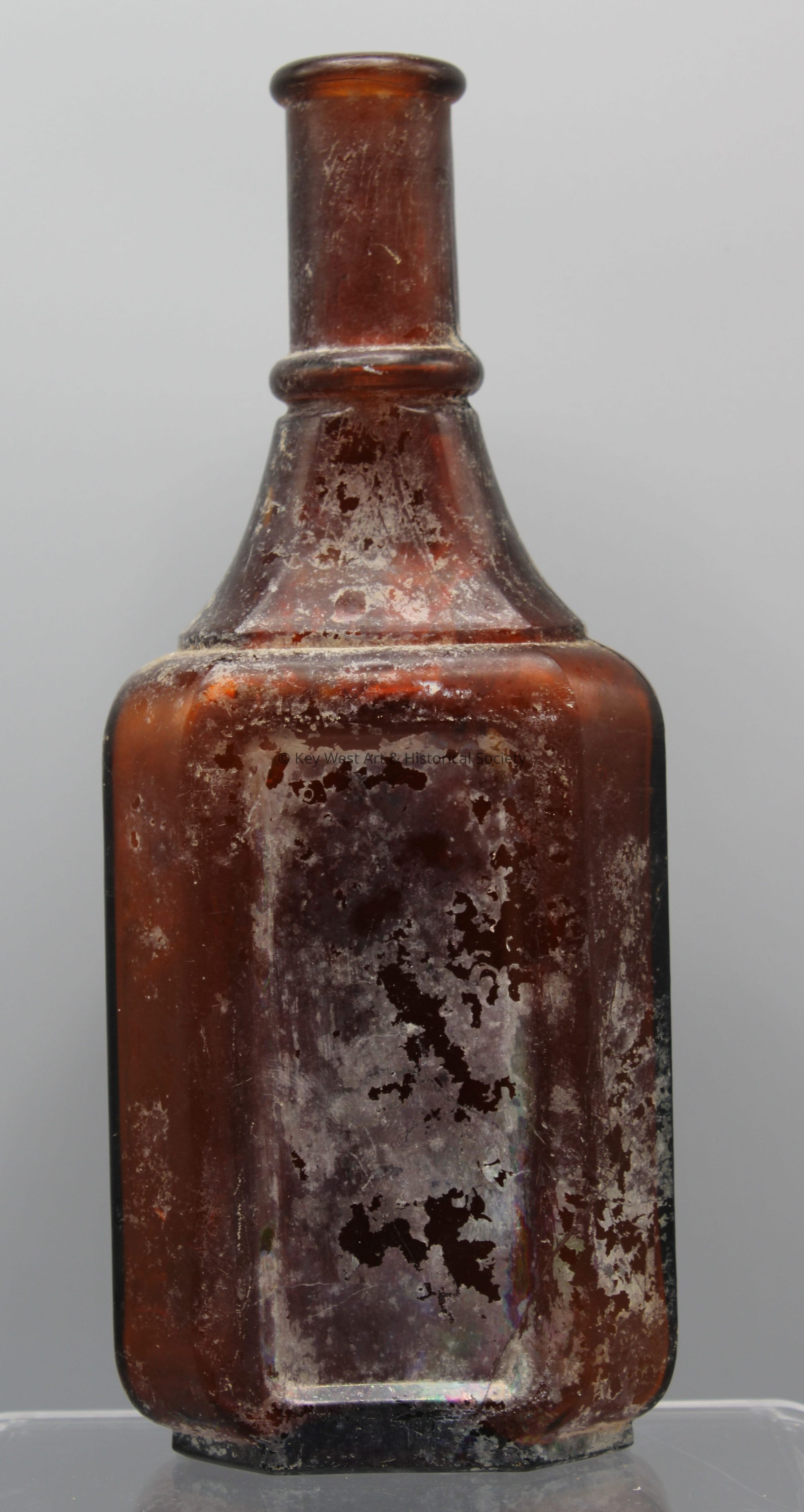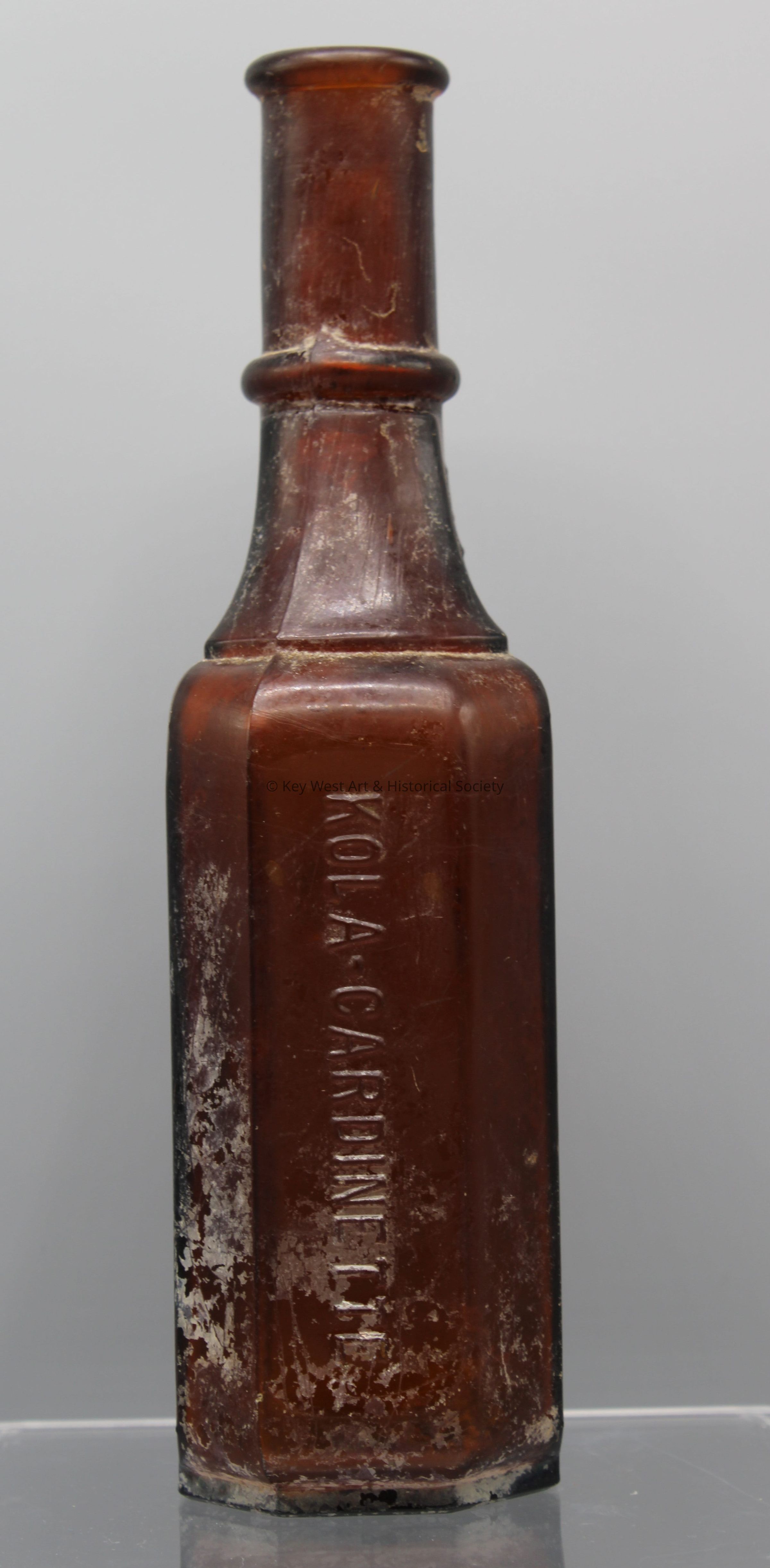 Brown glass bottle with a long tapered neck. The short sides are embossed with 'Kola-Cardinette.' One side of the neck of the bottle is embossed with a diamond with overlapping letters 'K' and 'C.' The base of the bottle is embossed with 'The Palisade / MFG CO. / Yonkers. N.Y.'