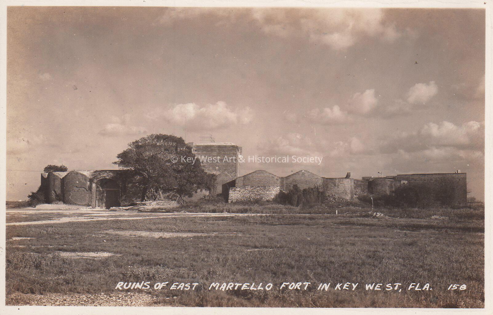 Postcard depicting a brick fort. The caption reads, 'Ruins of East Martello Fort in Key West, Florida'.Subject Place