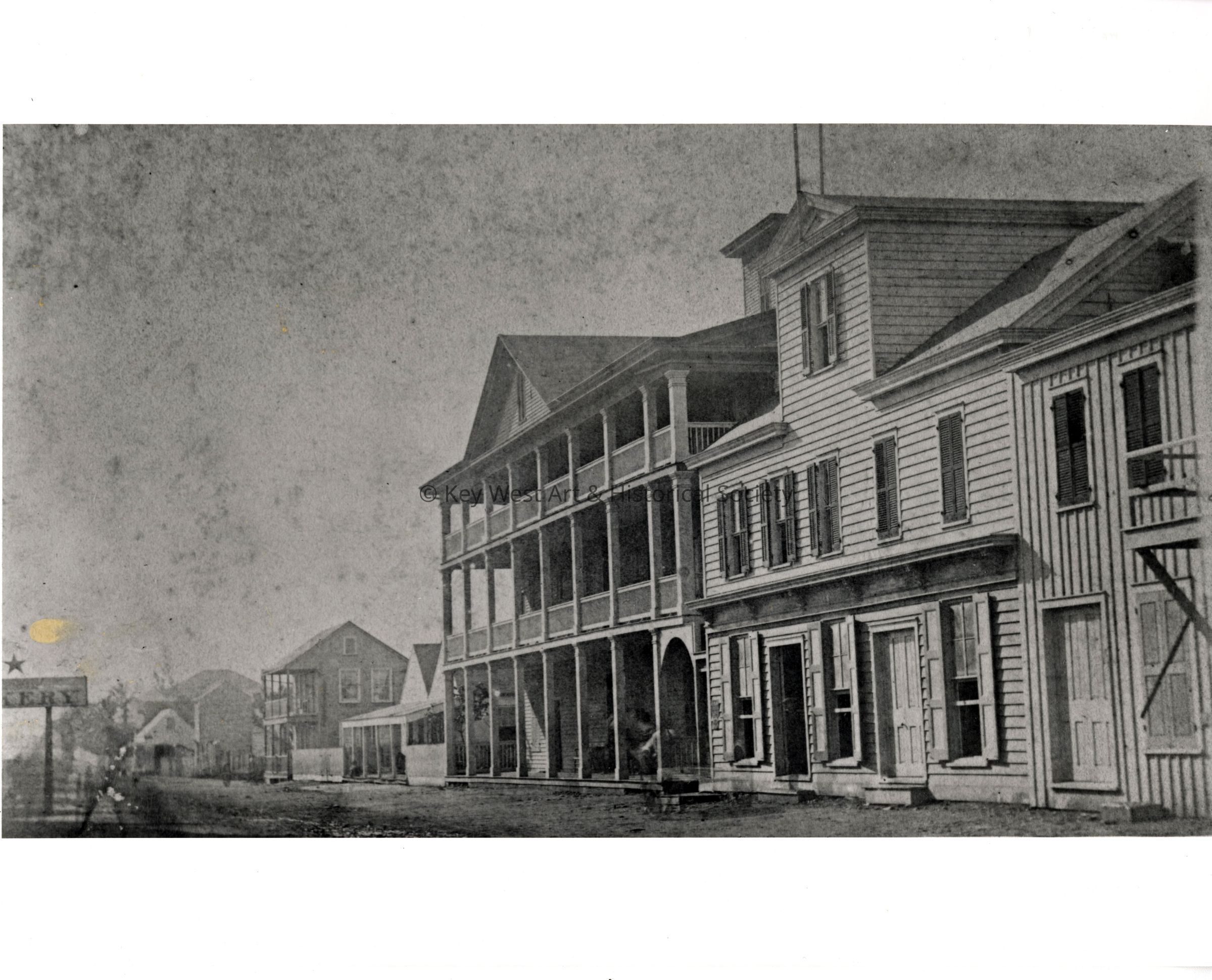 Black and white photograph of the Russell House hotel on the 100 block of Duval Street.