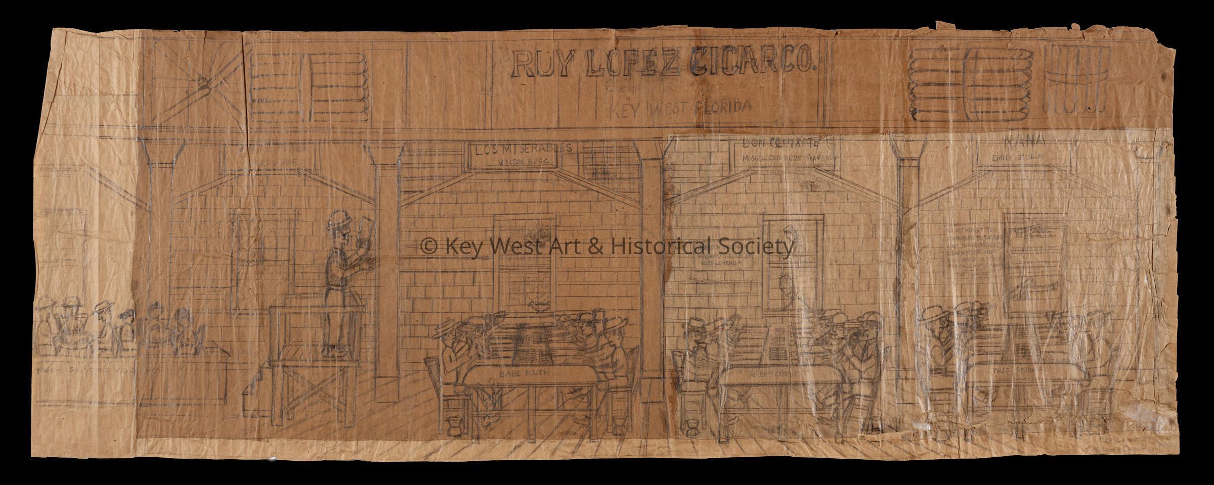 Pencil sketch on an unfolded paper bag by Mario Sanchez depicting the interior of the Ruy Lopez Cigar Company factory. Cigarmakers are rolling cigars while the Reader stands on his platform reading from a book to the cigarmakers.Type of Drawing