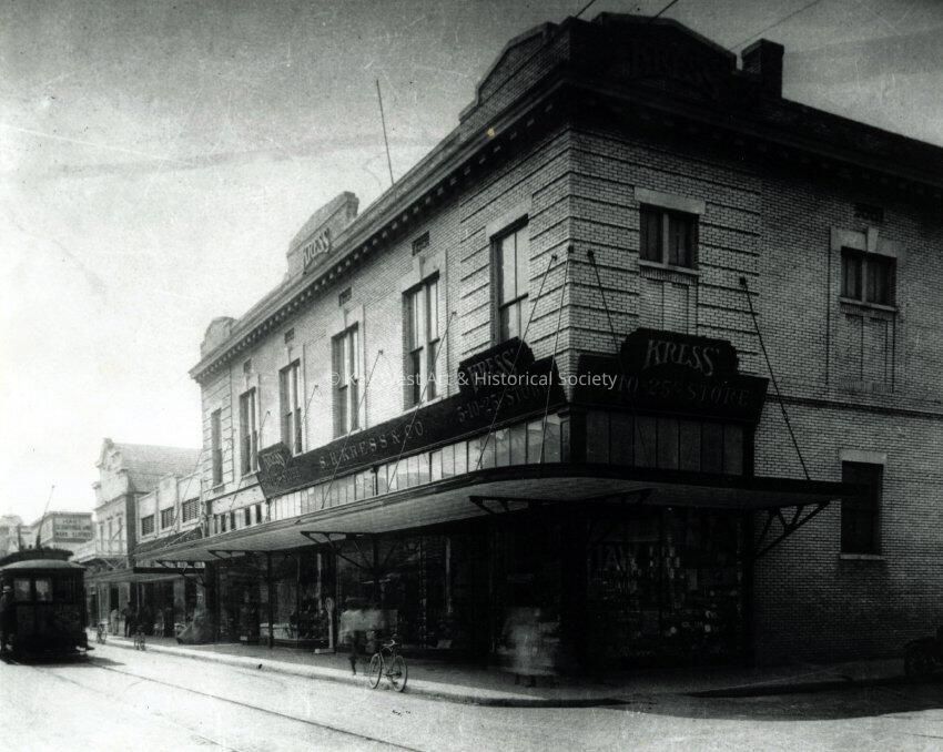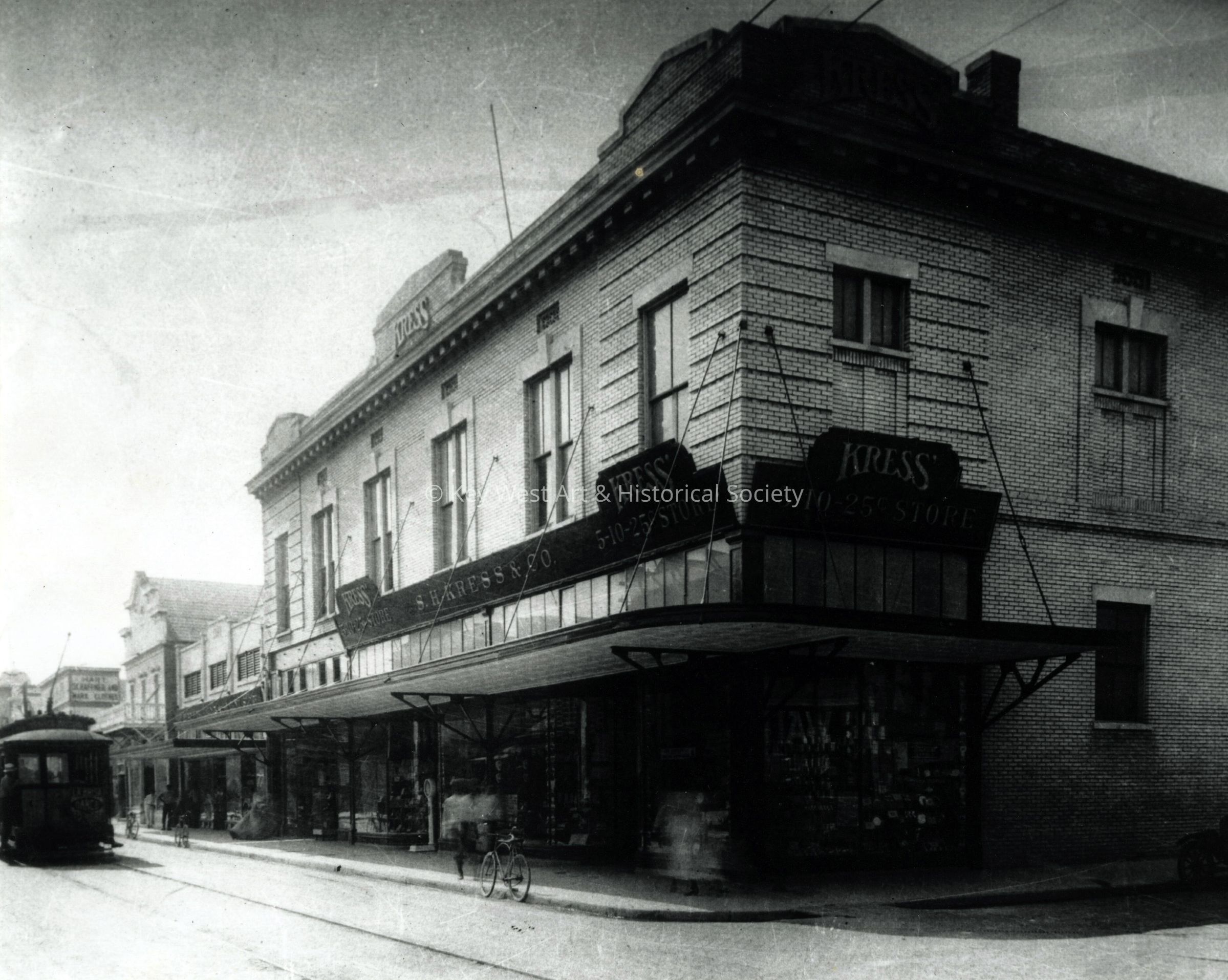 A black and white photograph of the S.H. Kress & Co building located at 500 Duval Street. A streetcar is traveling on Duval Street.