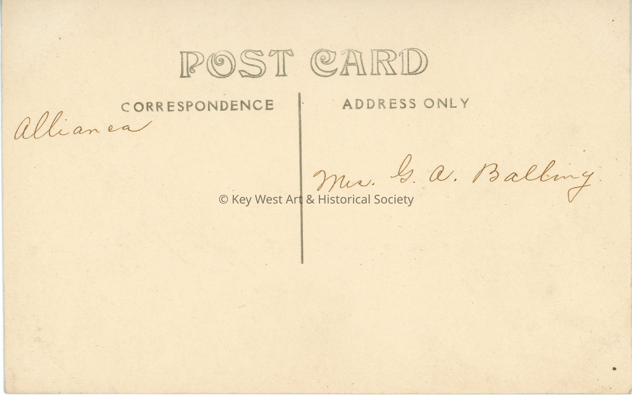 Black and white photograph postcard depicting ship S.S. Allianca with passengers on the Panama Canal. The Allianca was the first passenger ship to enter a lock on the Canal. The postcard is addressed to Mrs. G.A. Balling. Verso has a handwritten note.Subject