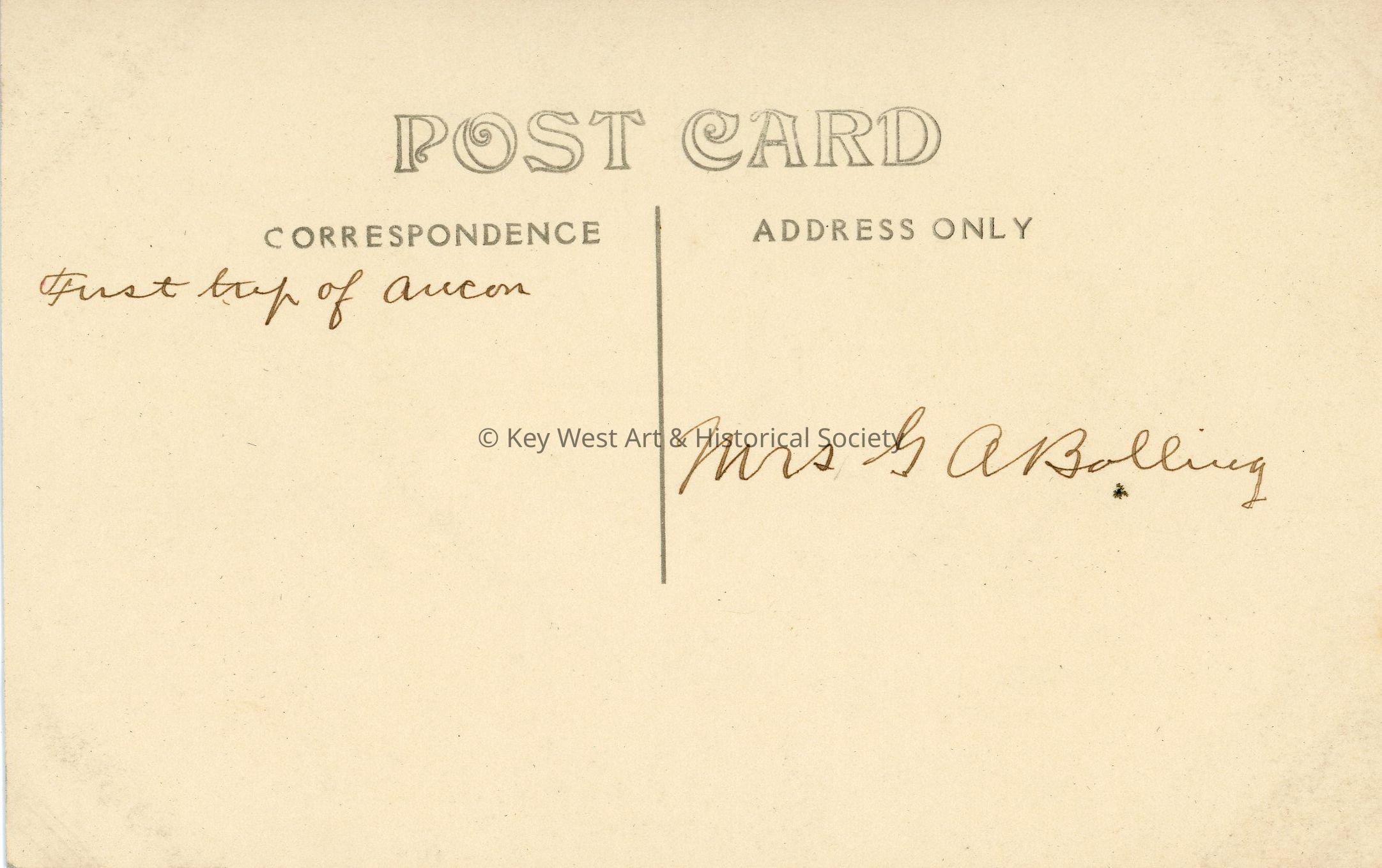 Black and white photograph postcard depicting the ship S.S. Ancon on the Panama Canal. The Ancon was the vessel that made the first official trip through the Panama Canal in 1914. The photograph was likely taken at the Gatun Locks. The postcard is addressed to Mrs. G.A. Balling. Verso has a handwritten note.Subject