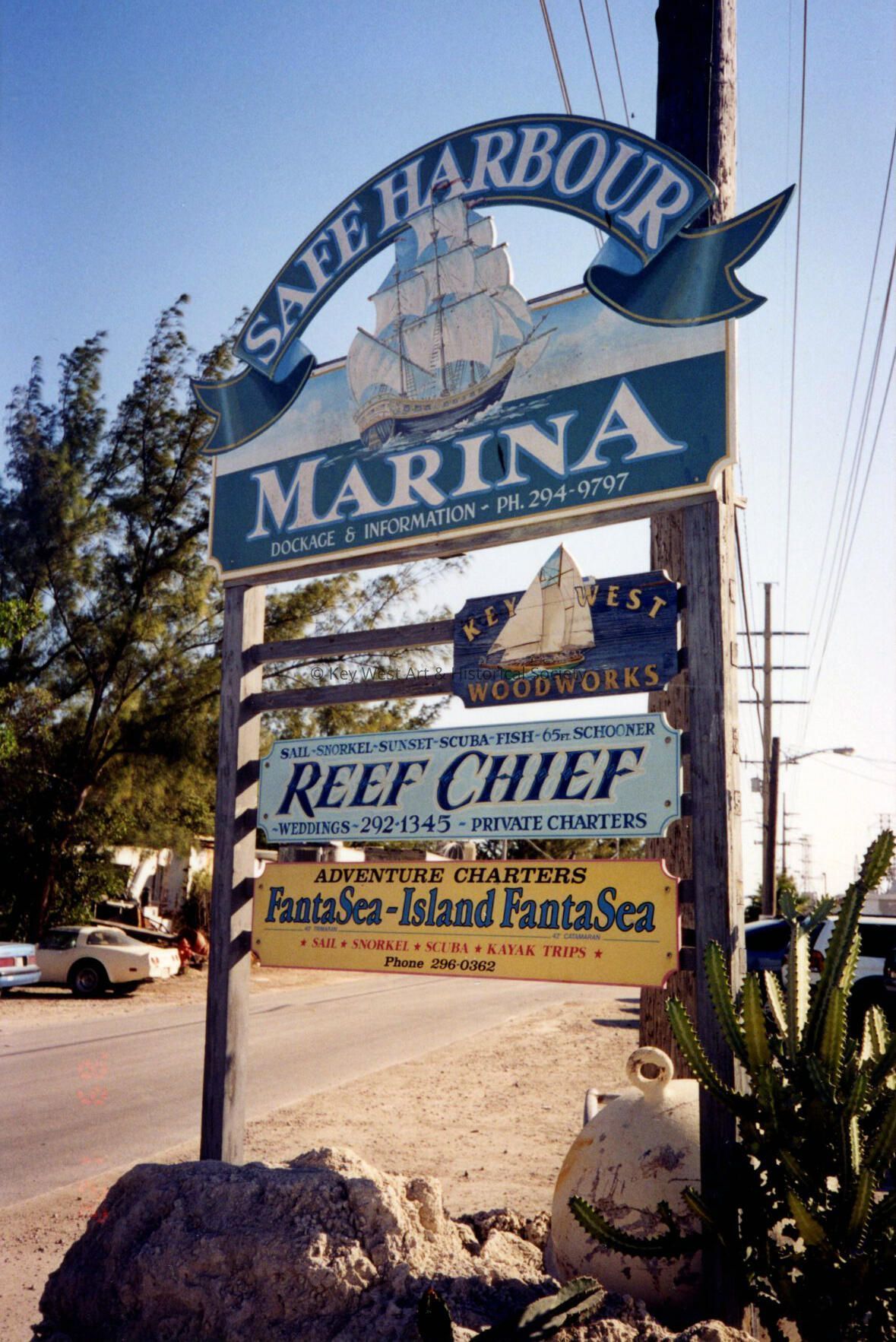 Color photograph taken by historian James M. Goode of the Safety Harbour Marina sign on Stock Island during a trip to Key West in February 2001. Printed from Roll 10.Collection