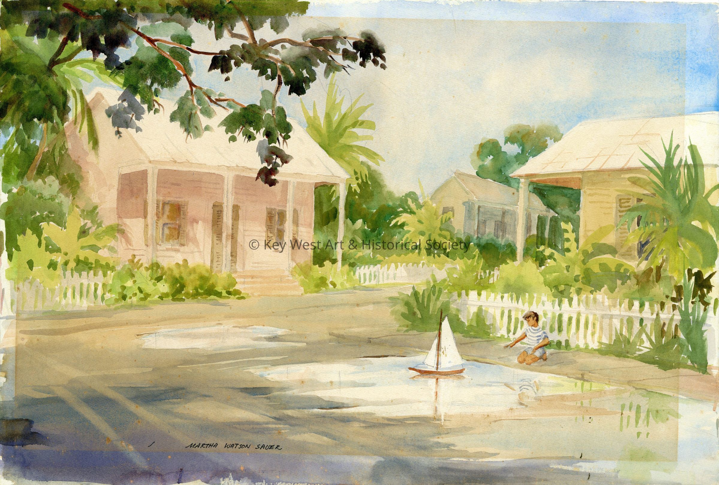 Watercolor on paper by Martha Watson Sauer depicting a young boy playing with a toy sailboat in a puddle on a Key West street.Artwork Details