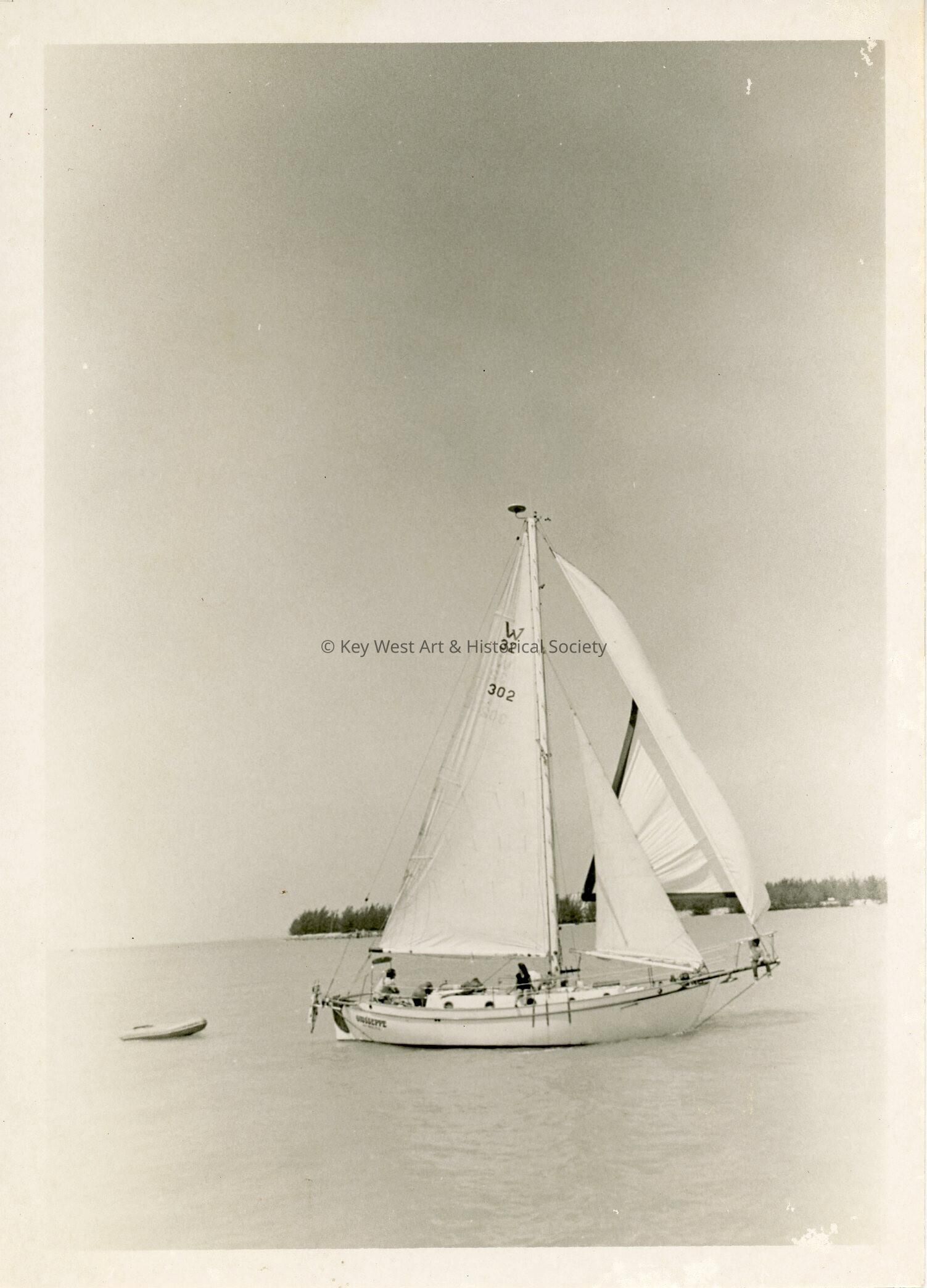 Black and white photograph of a sailboat in Key West harbor.