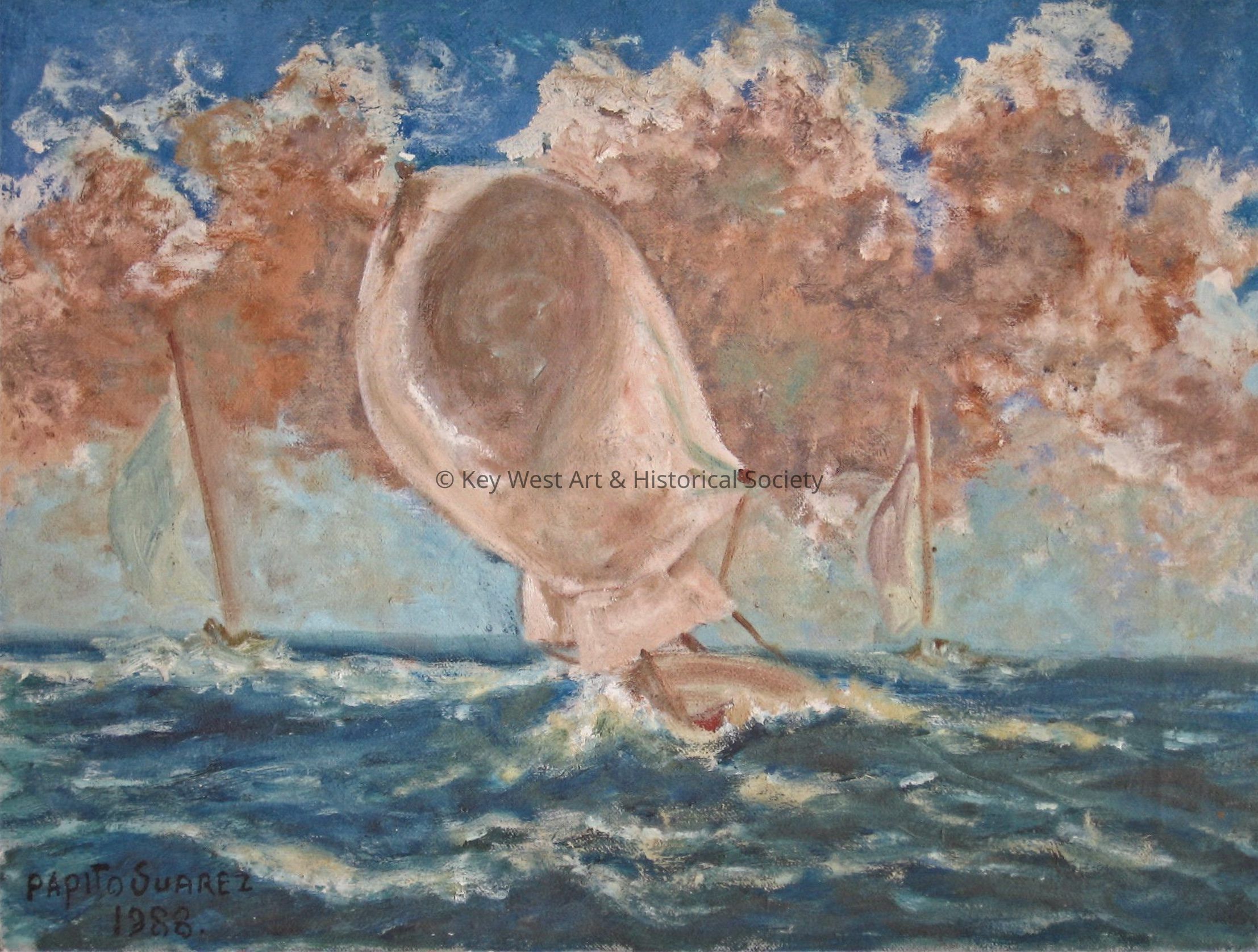 Giclee print taken from a painting by Papito Suarez depicting a sailing race in rough seas. Three sailboats are visible in the scene with the lead vessel's sail billowing out in the strong wind.Type of Print