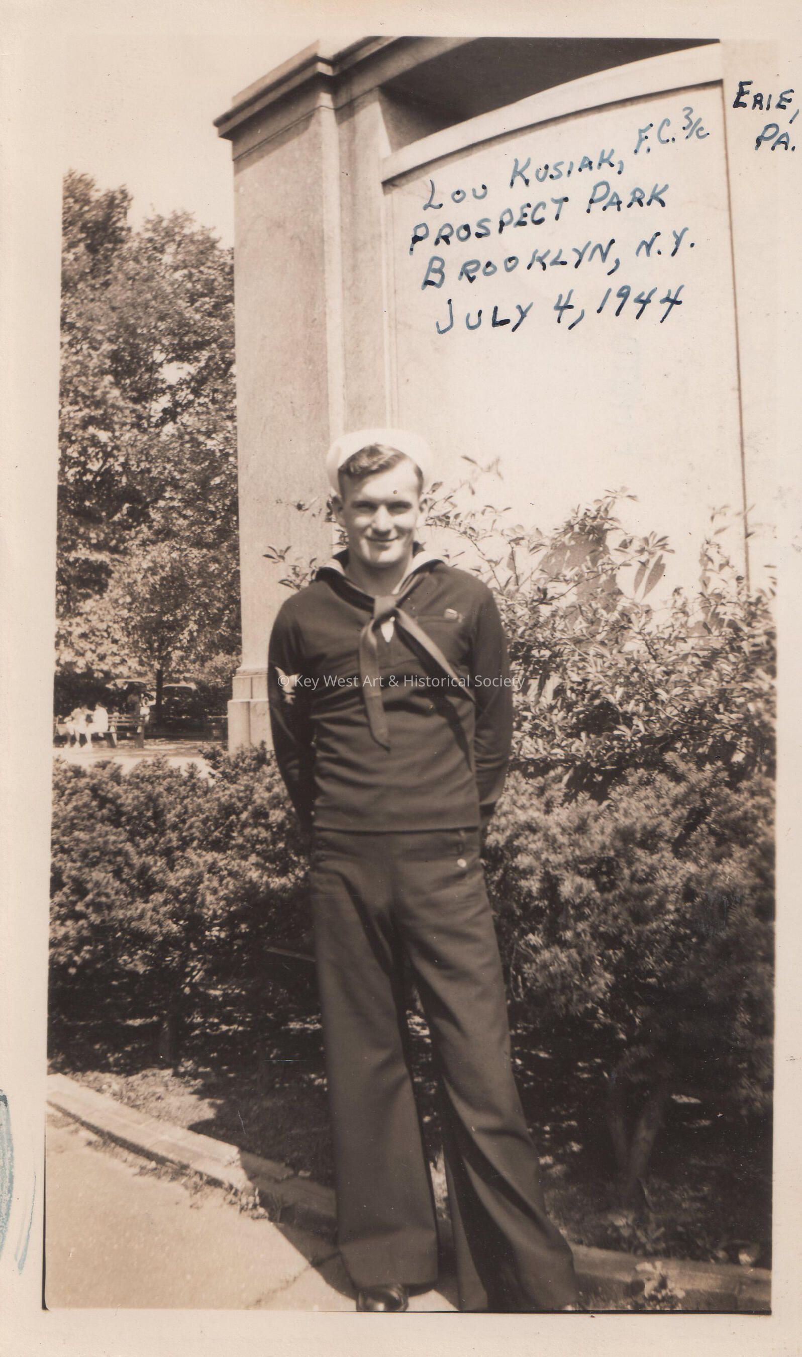 Sailor from the U.S.S. Key West (PF-17) on July 4, 1944; Lou Kusiak, F.C. 3/c Erie, PA, at Prospect Park, Brooklyn, NY.Collection