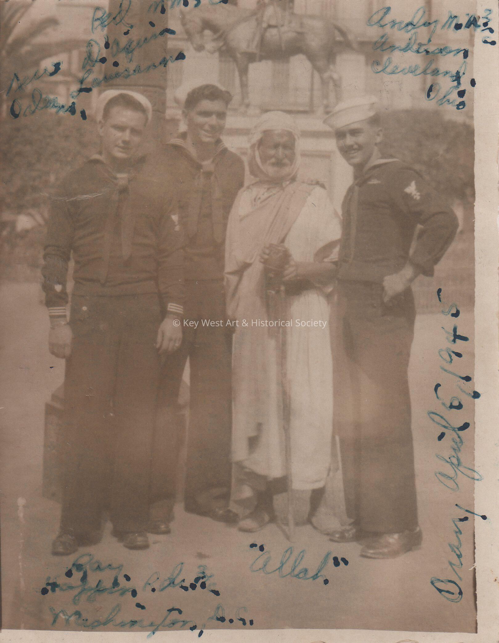 Sailors from the U.S.S. Key West (PF-17) on April 6, 1945; left to right at Red Dagin of Louisiana, Andy ___ of Cleveland, Ohio, "Allah", and Ray Happin of Washington, DC, in Oran.Collection