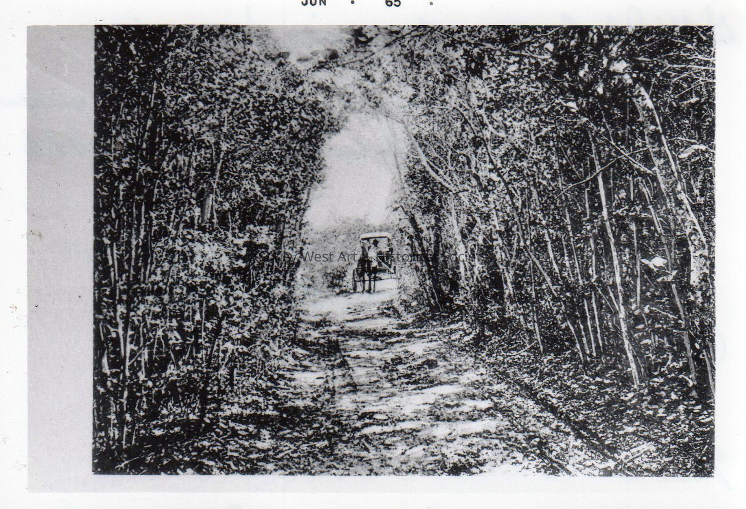 Black and white photograph of a horse and wagon traveling along the road leading to the Key West Salt Ponds.