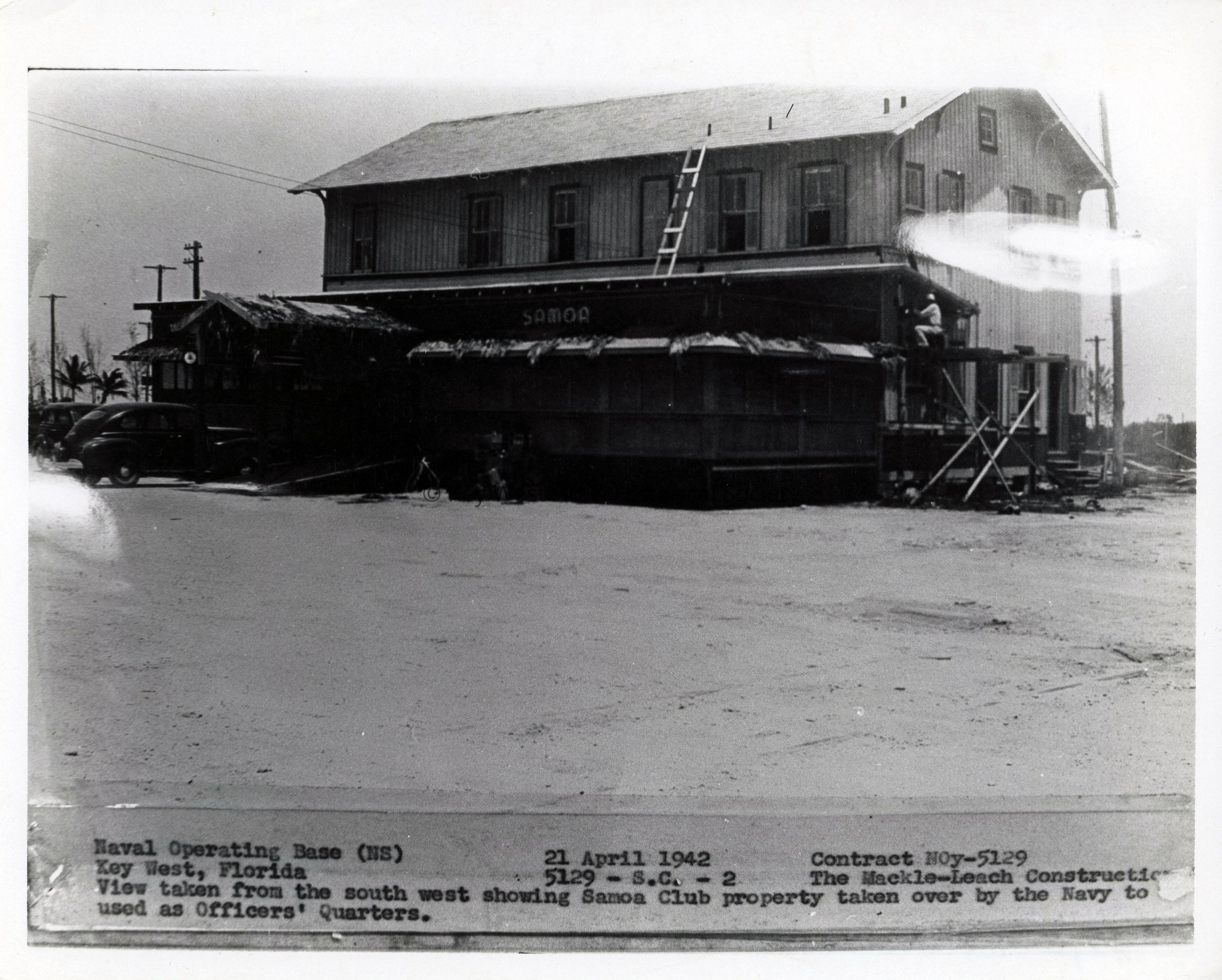 Black and white photograph of the Samoa Club on Trumbo Point. It was a former Overseas Railway Express building that was eventually taken over in 1942 by the U.S. Navy to be used as officers quarters.