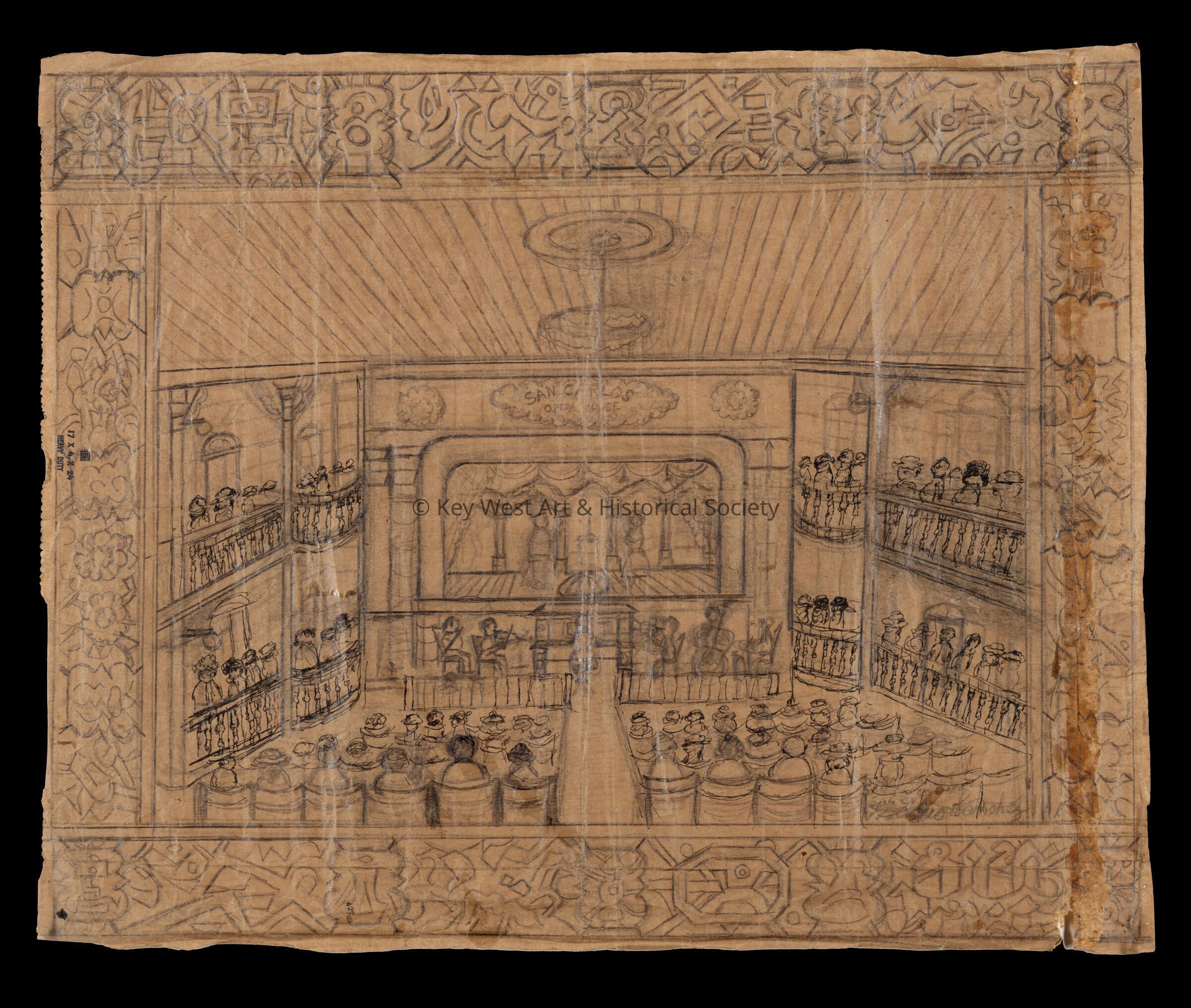 Pencil sketch on an unfolded paper bag by Mario Sanchez depicting the interior of the San Carlos Opera House on Duval Street.Type of Drawing