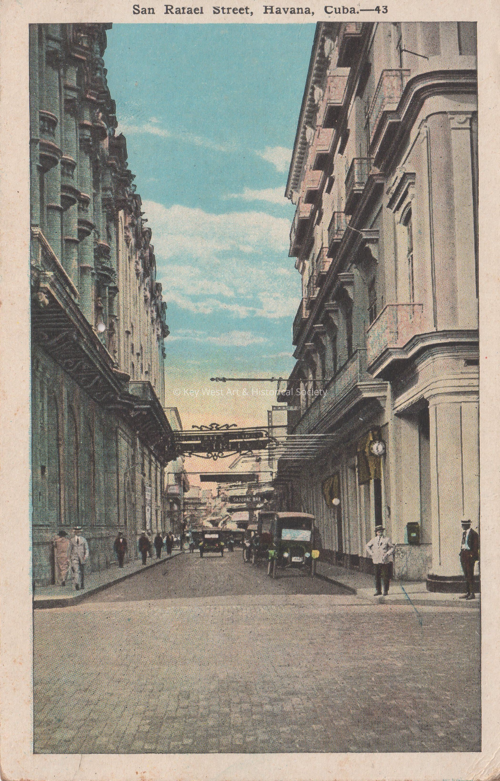 Postcard depicting people and cars on a city street. The caption reads, ‘San Rafael Street, Havana, Cuba.’ The description on the verso reads, ‘The inner part of the city is old, and up to the time of the American occupation had narrow, crooked streets, unkempt and unpaved. The newer portion of the city is well designed, with broad streets, beautiful promenades and drives, and picturesque parks or plazas.’Subject Place