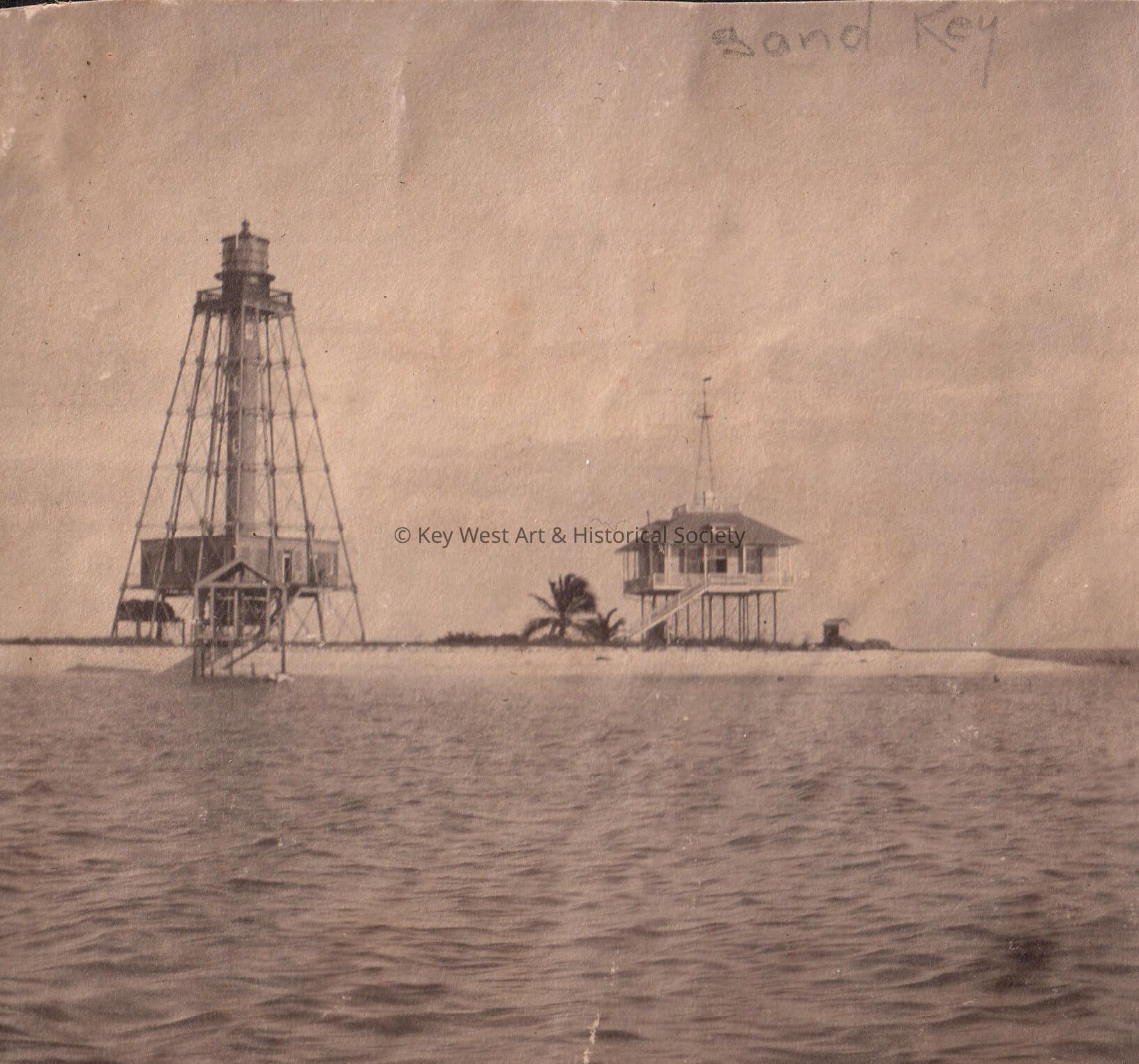 Black and white photograph of Sand Key Lighthouse and the adjacent weather station.