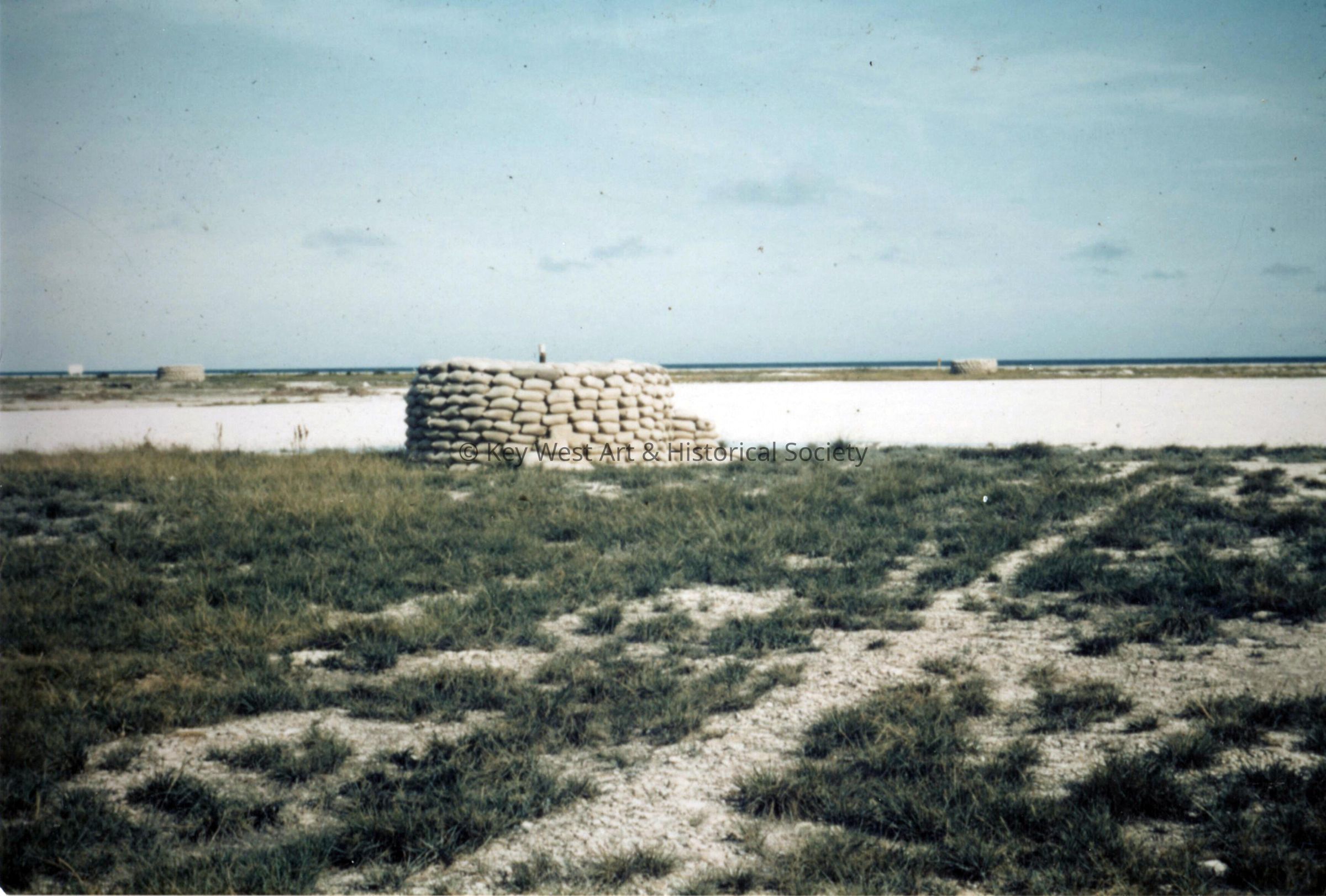 Color photograph of a sandbag bunker at Fort East Martello during World War II.