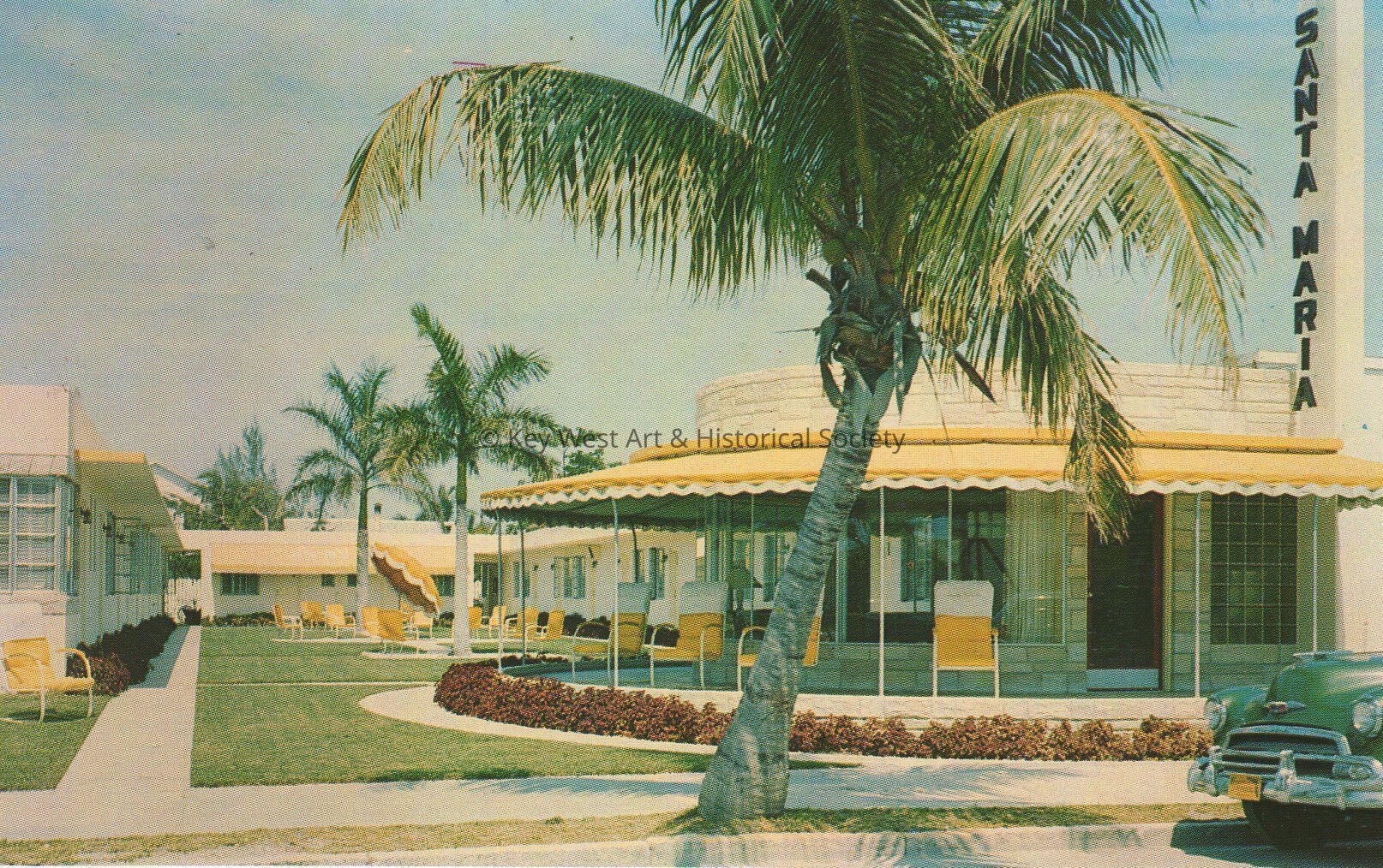 Postcard depicting a hotel with a sign that reads, ‘Santa Maria'. The description on the verso reads, 'Santa Maria, 1401 Simonton, Key West, Florida. 14 rooms, centrally heated, circulating ice water, 11 house-keeping apartments. All units 100% air-conditioned. Maid service. Attractive Lobby, lounge. Ocean 200 feet. Beach Privileges at private club. Fireproof garage. Room phones and switchboard service. Telephone 2-5678.'Subject Place