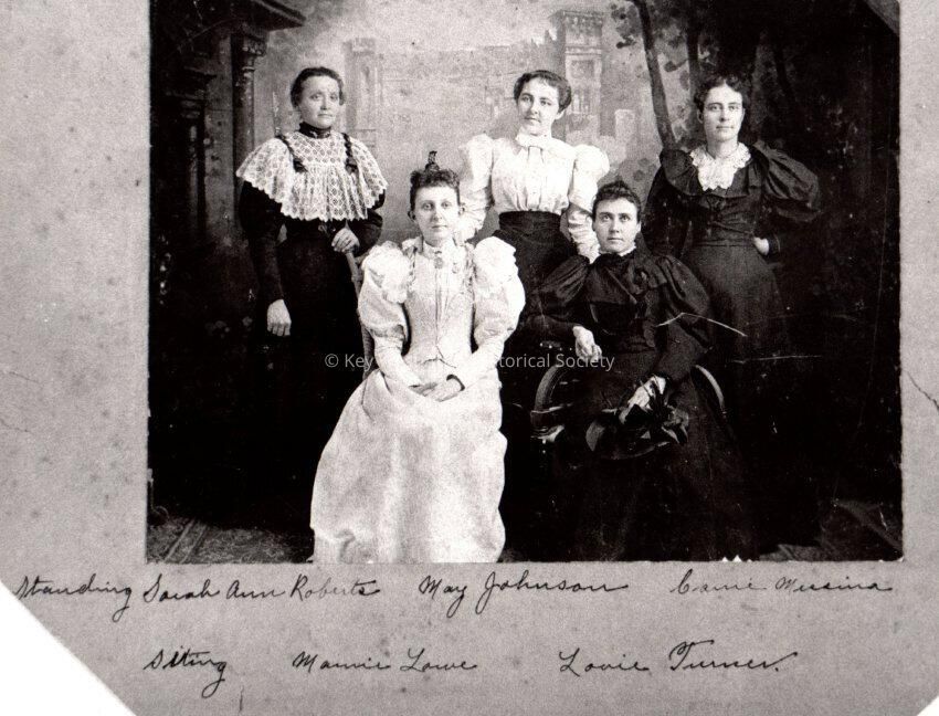Black and white photograph of five Key West women. Standing (l-r) Sarah Ann Roberts, May Johnson, and Carrie Messina. Sitting (l-r) are Marnie Lowe and Lovie Turner.Collection