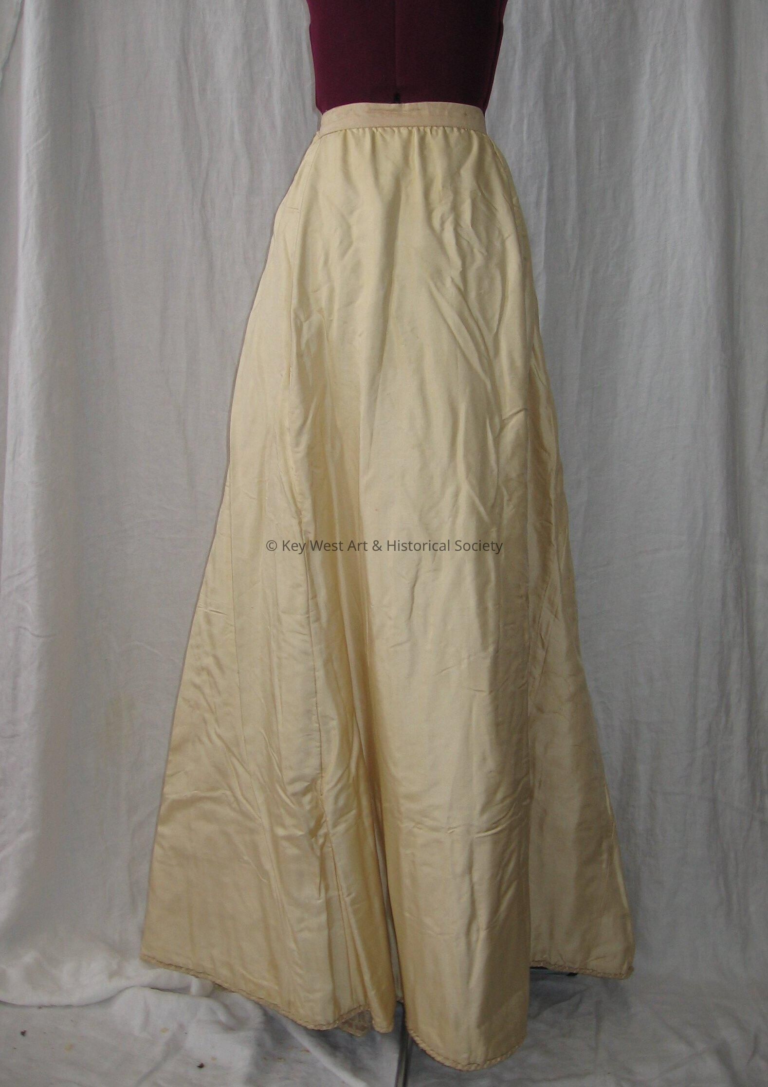 Full length, full gored skirt of white or ivory silk. Has a 1-inch silk waistband, closed at the back. Lined and faced with cotton.Collection