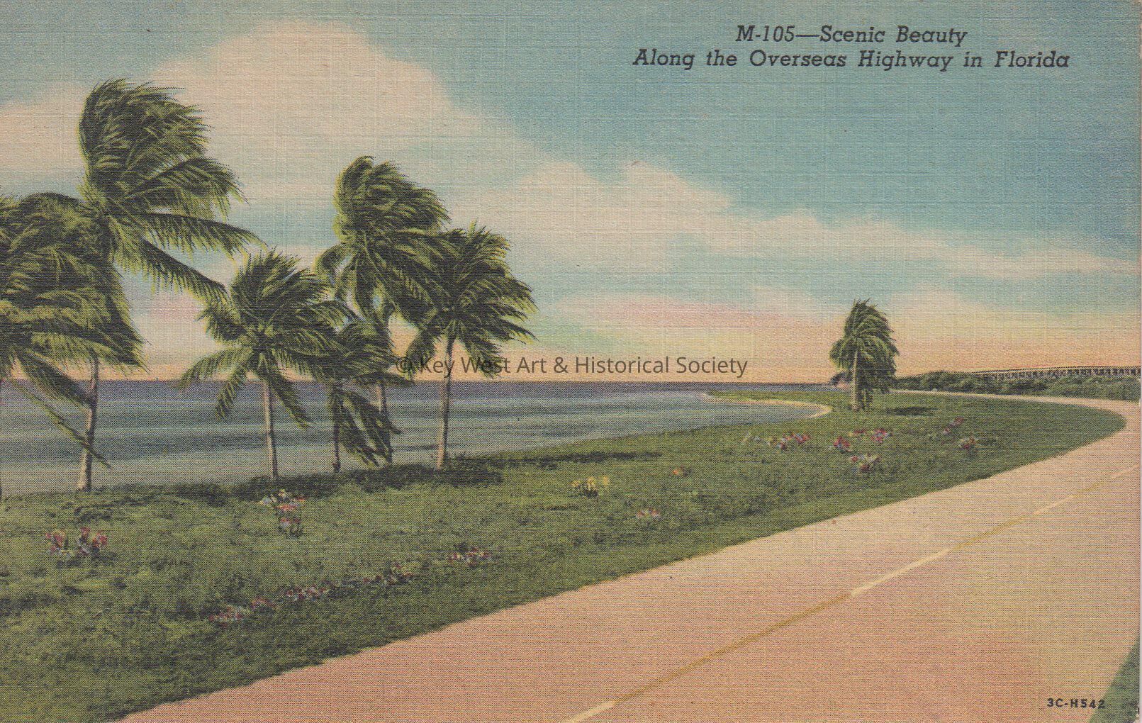 Postcard depicting palm trees along the Overseas Highway, possibly at Bahia Honda Key. The caption reads, ‘Scenic Beauty. Along the Overseas Highway in Florida.’Subject Place
