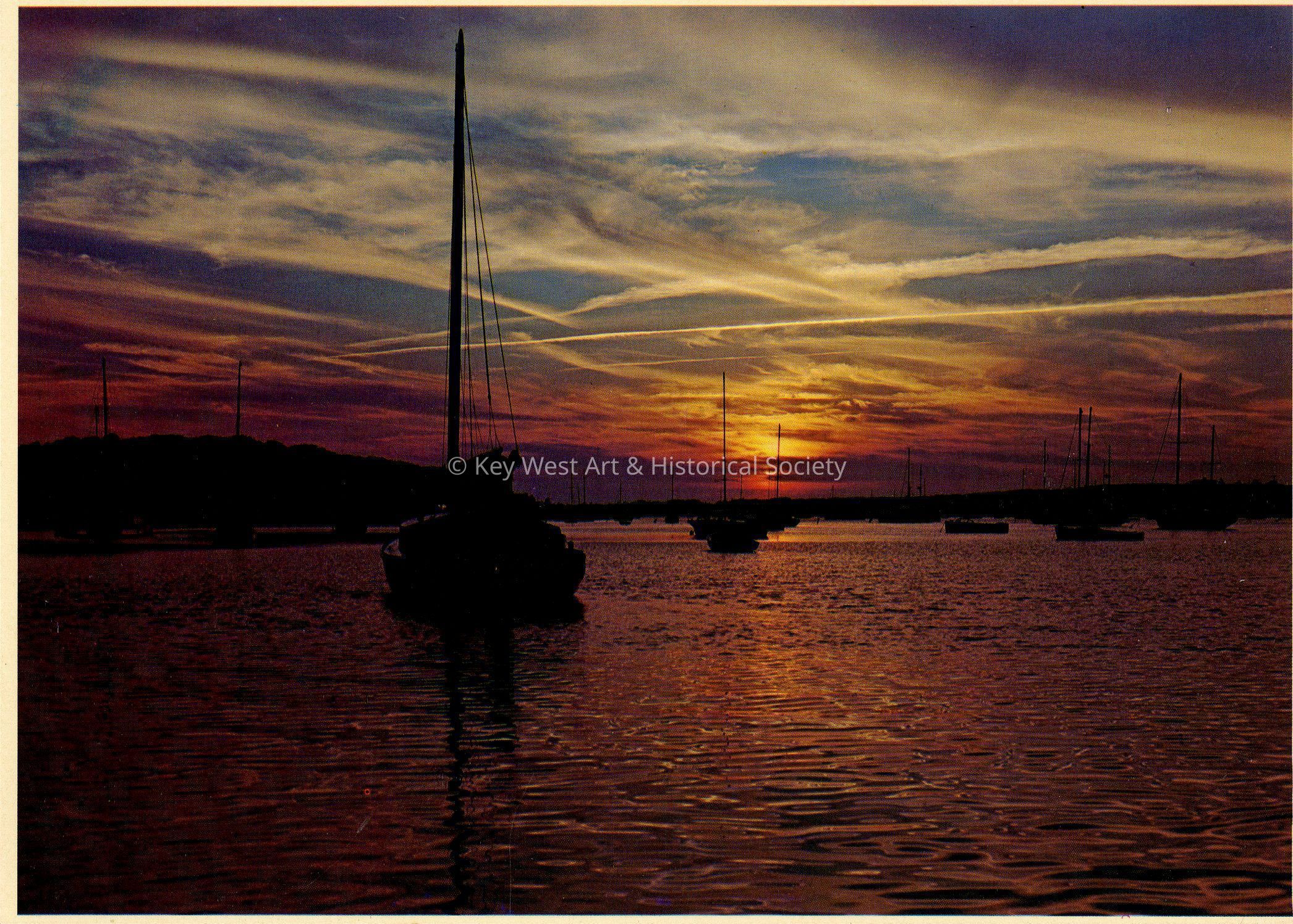 Postcard depicting a group of sailboats taken during a Florida sunset.
