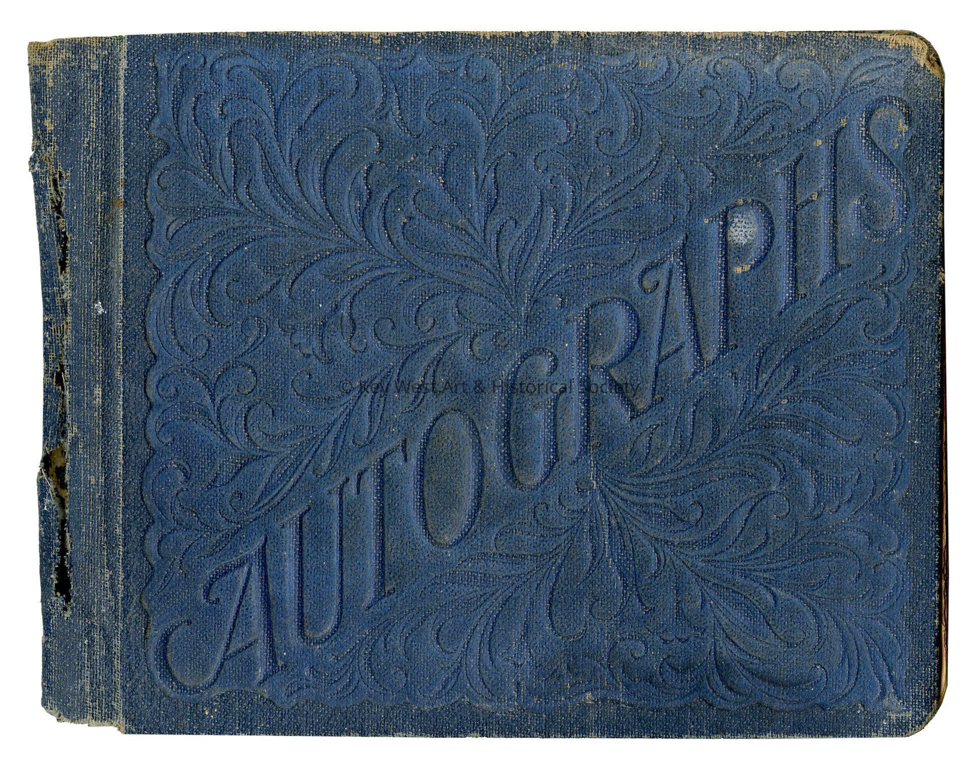 Autograph book with embossed blue hard cover belonging to Marguerite Page from her time at Key West High School. The book is signed by many of her Key West schoolmates including Wilhelmina Harvey.
