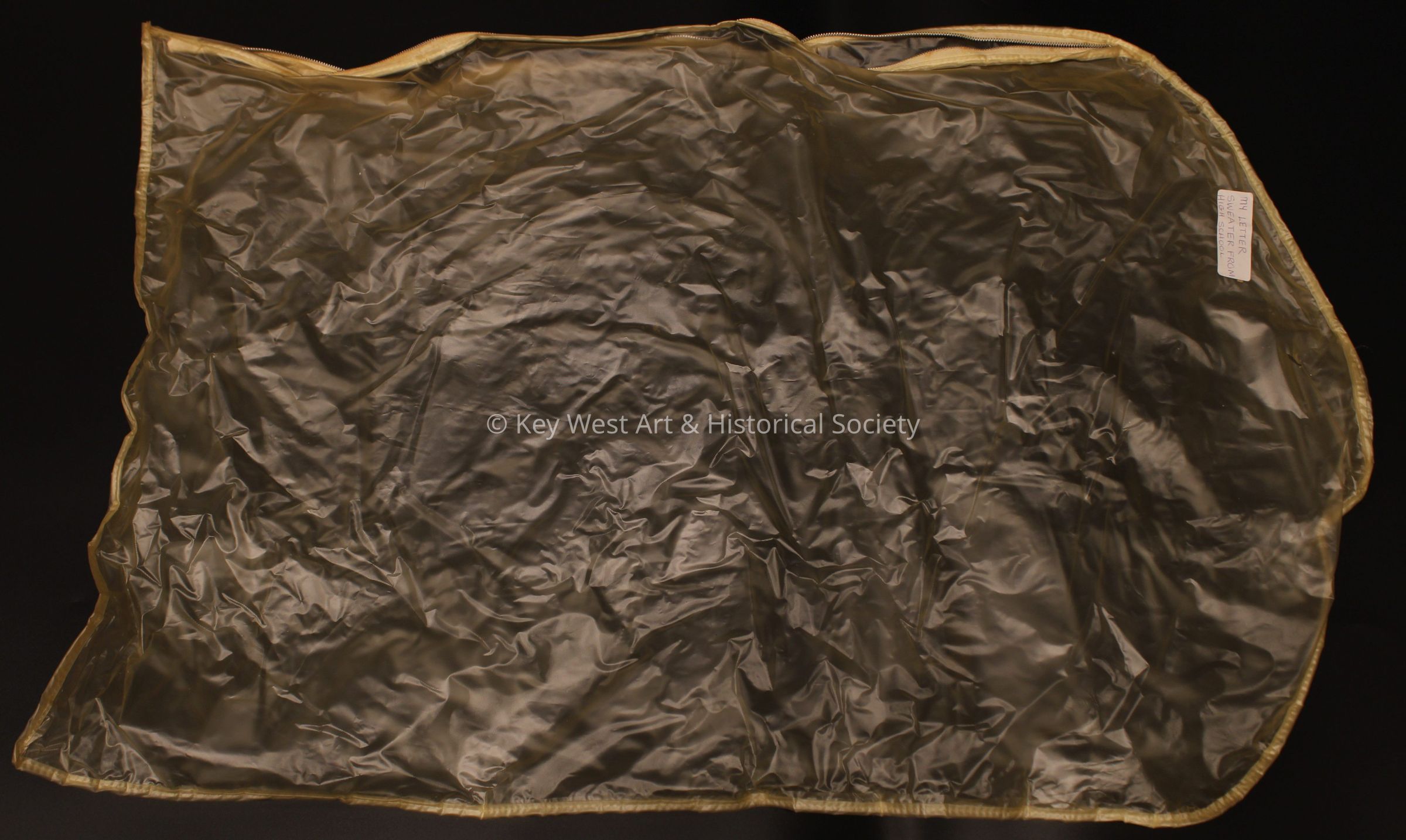 An undecorated letterman sweater with pockets and button closure belonging to Sandra Lee Sweeting Hughes of the Key West High School Class of 1962.