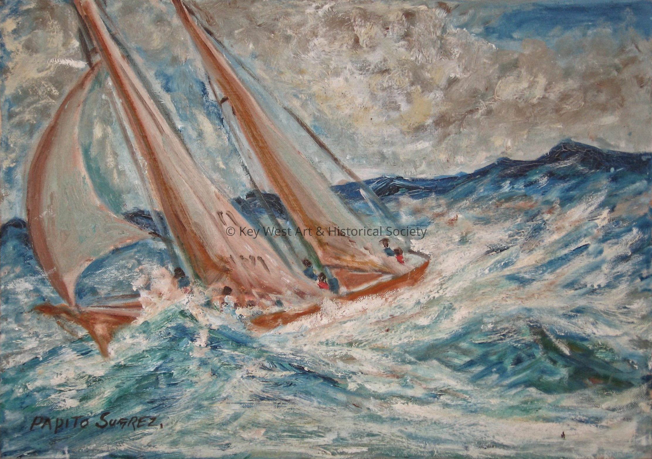Oil on canvas by Papito Suarez depicting a two masted sailboat in a rough sea.Type of Painting