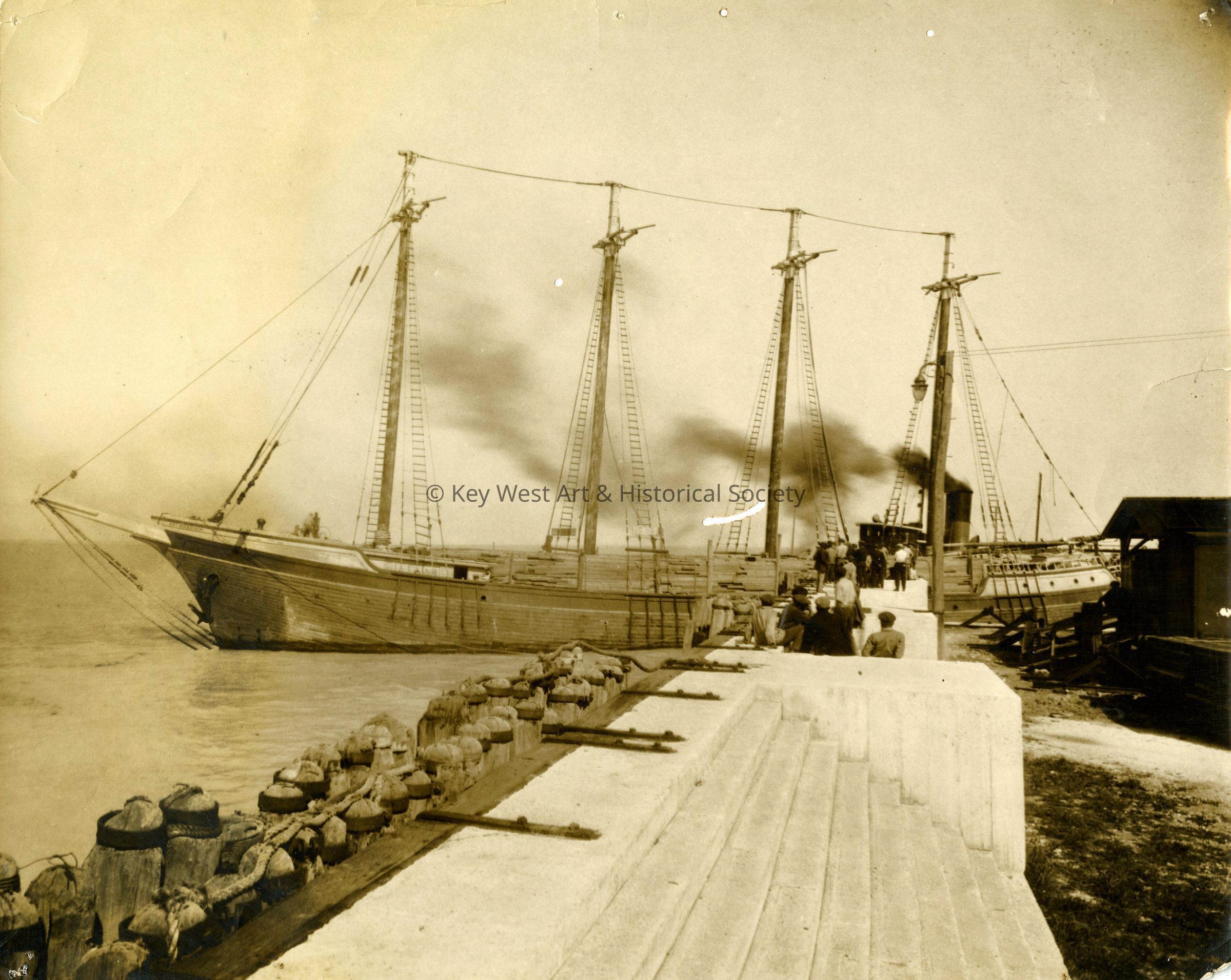 Black and white photograph of the four-masted schooner PAT HARRISON of Mobile, Alabama, alongside a train at the Florida East Coast Railway depot in Key West. She is carrying a large cargo of lumber.Photograph Details