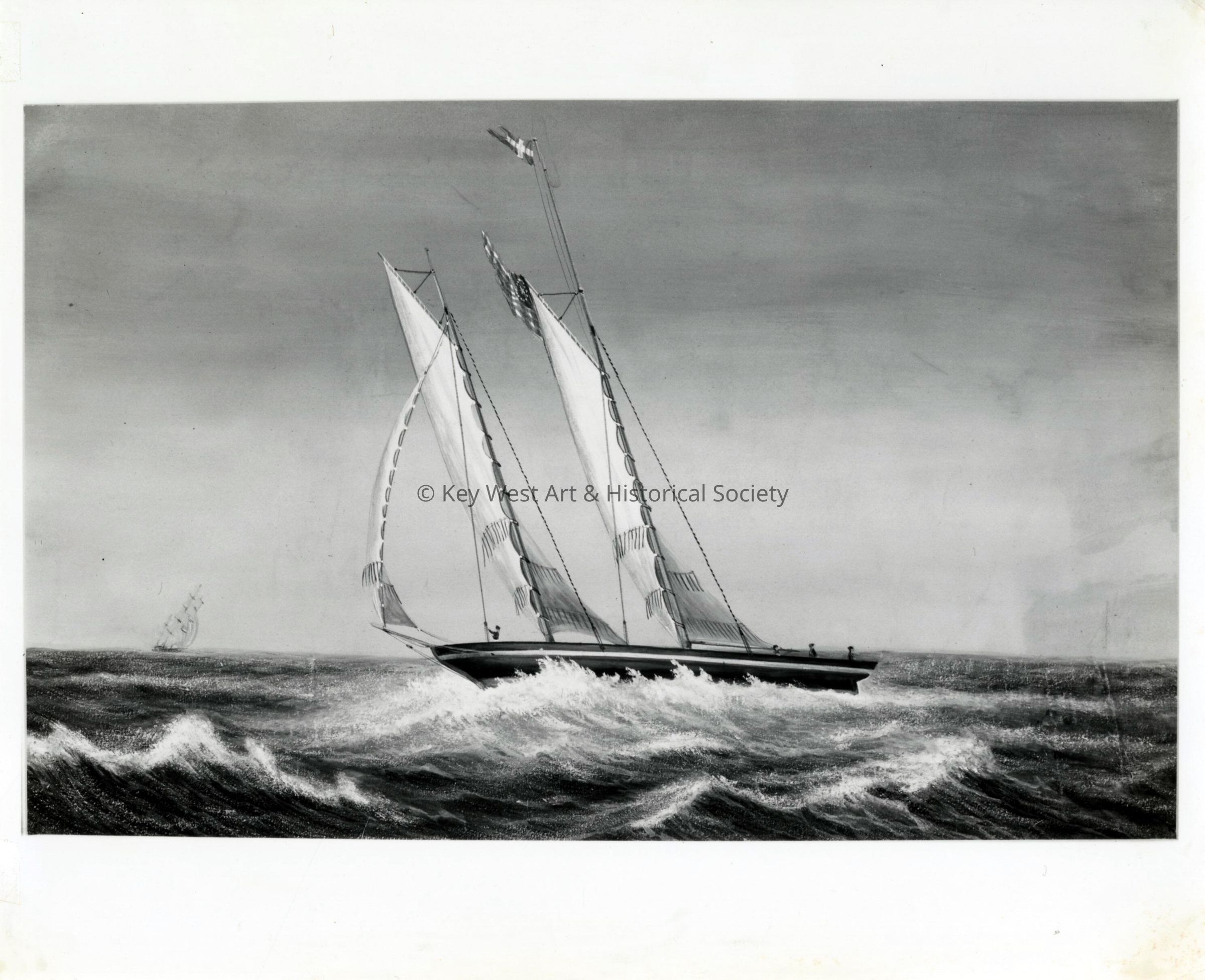 Black and white photograph of a watercolor of the schooner Raven built in Boston in 1836. The Raven was typical of smaller New England-built wrecking schooners.