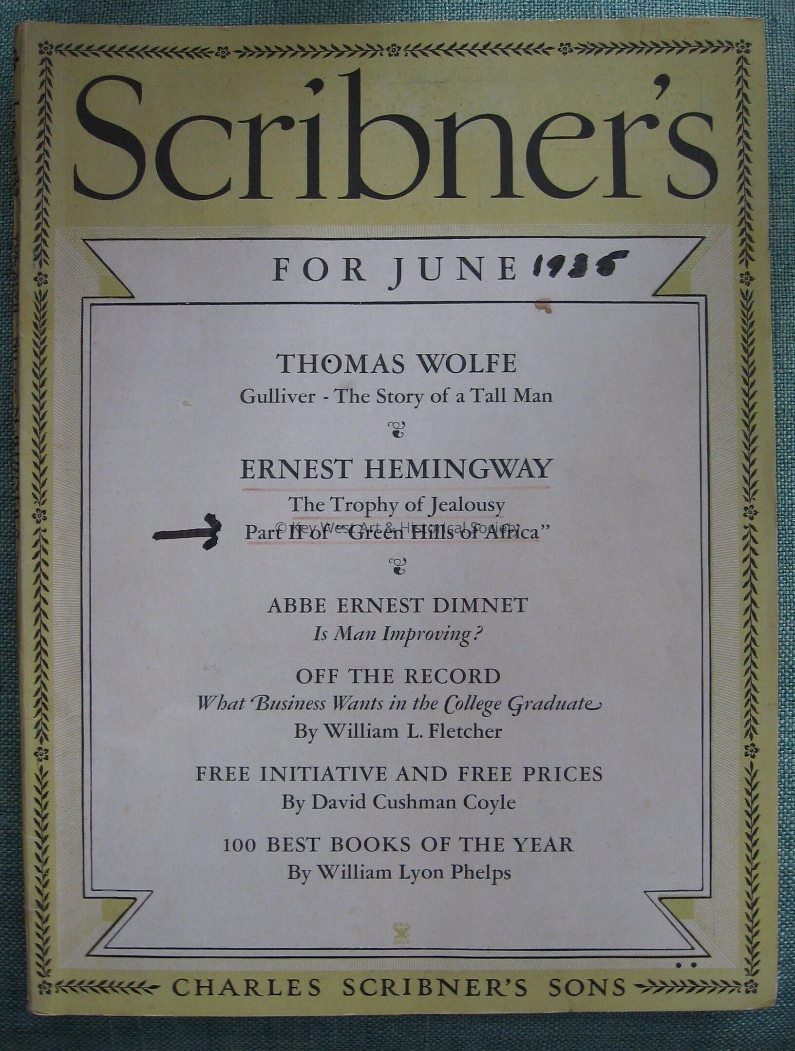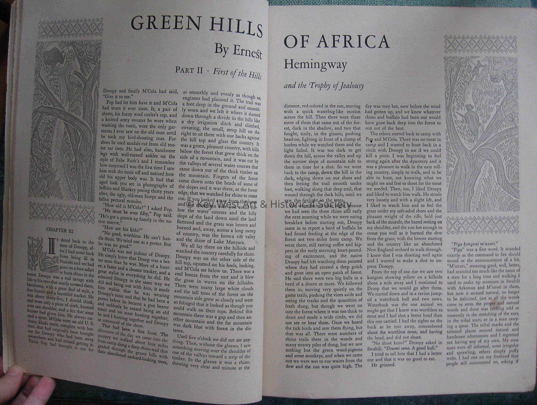 June 1935 issue of Scribner's Magazine with the story 'Green Hills of Africa Part II First of the hills and the Trophy of Jealousy' by Ernest Hemingway. Pages 334-344.