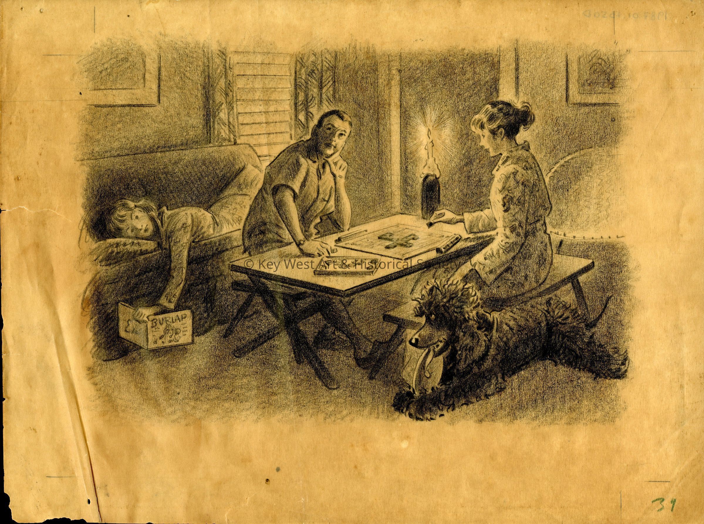 A pencil sketch on brown paper created by Morgan Dennis for his 'Sea Dog' book. The sketch depicts a family reading and playing board games in the houseboat. This sketch appears on page 39 of the printed book.Type of Drawing