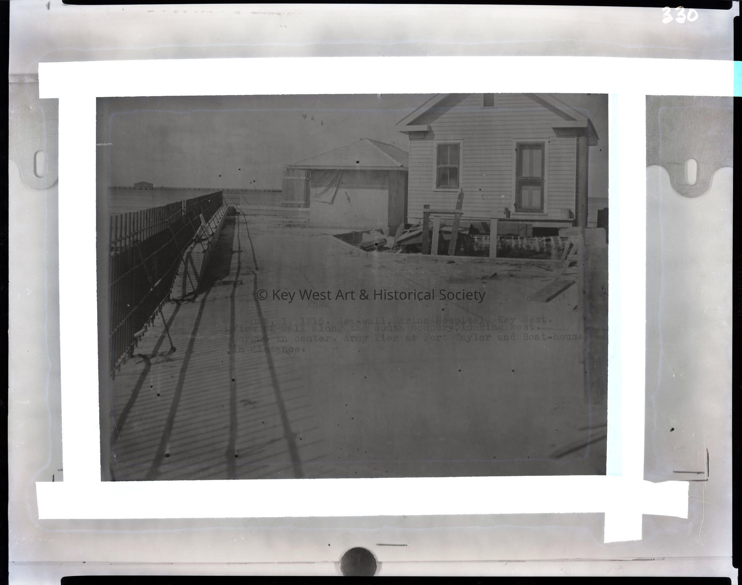 Black and white negative of the sea wall in front of the Marine Hospital at Naval Station Key West. This view is the wall along the south boundary looking west with the morgue in the center and the Army pier at Fort Taylor and boathouse in distance.