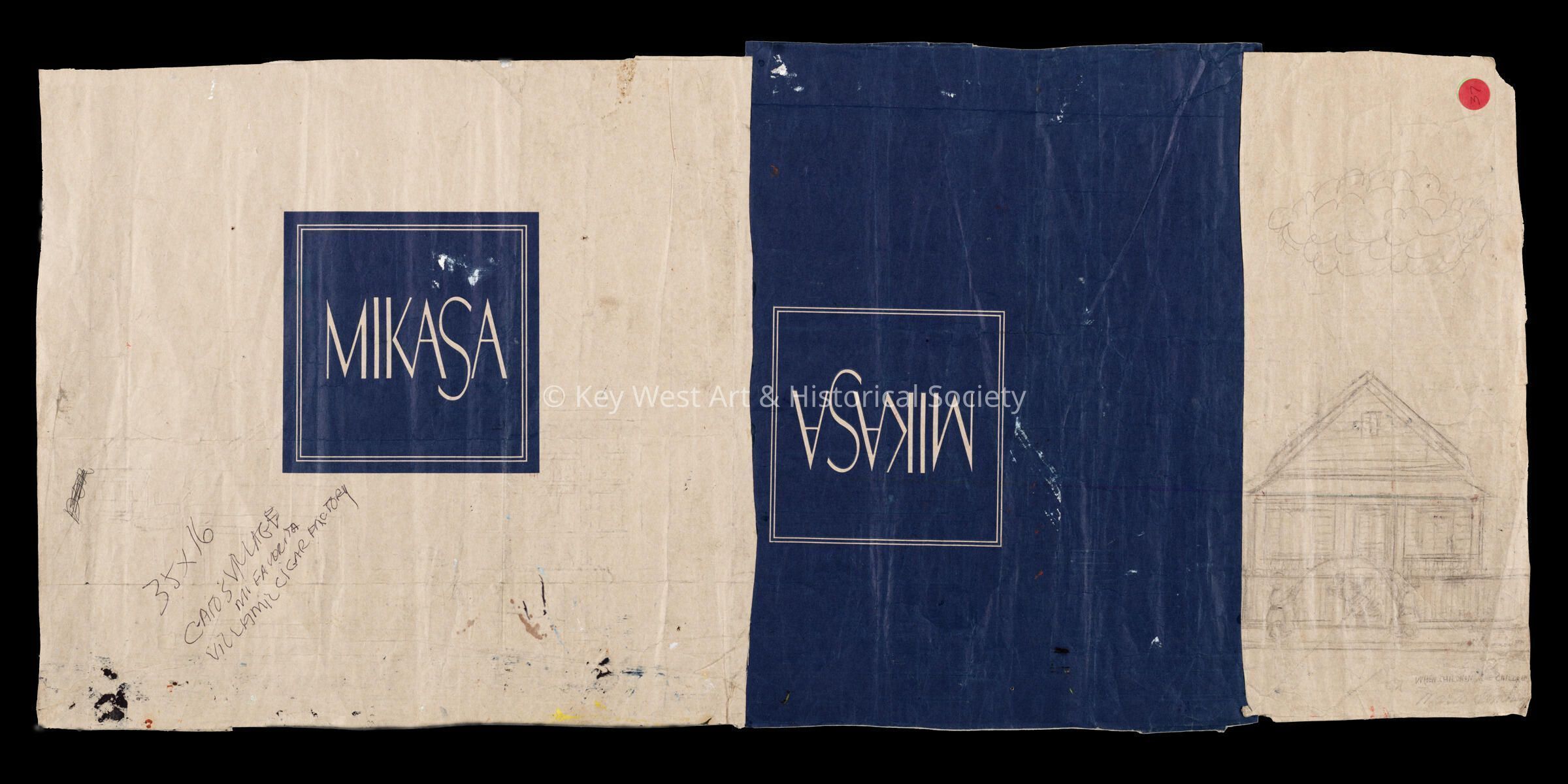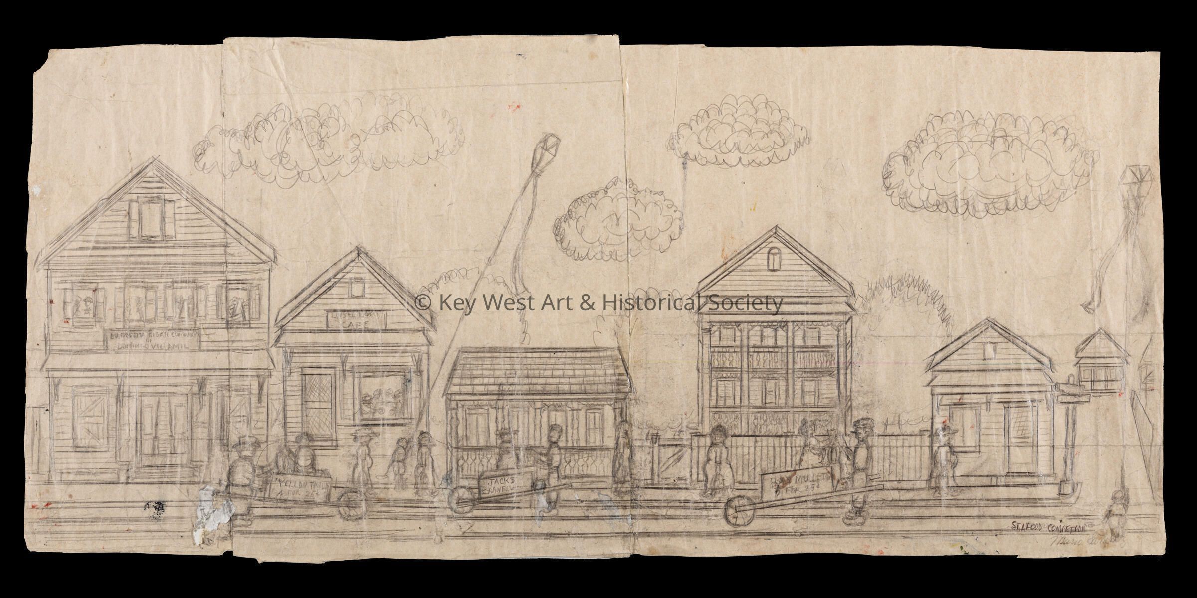 Pencil sketch on an unfolded paper bag by Mario Sanchez depicting three seafood vendors with carts selling their goods - Yellowtails for 25¢, Jack's Crawfisha and Bay Mullets 5 for 25¢. There is an unfinished sketch on the verso depicting a house.Type of Drawing
