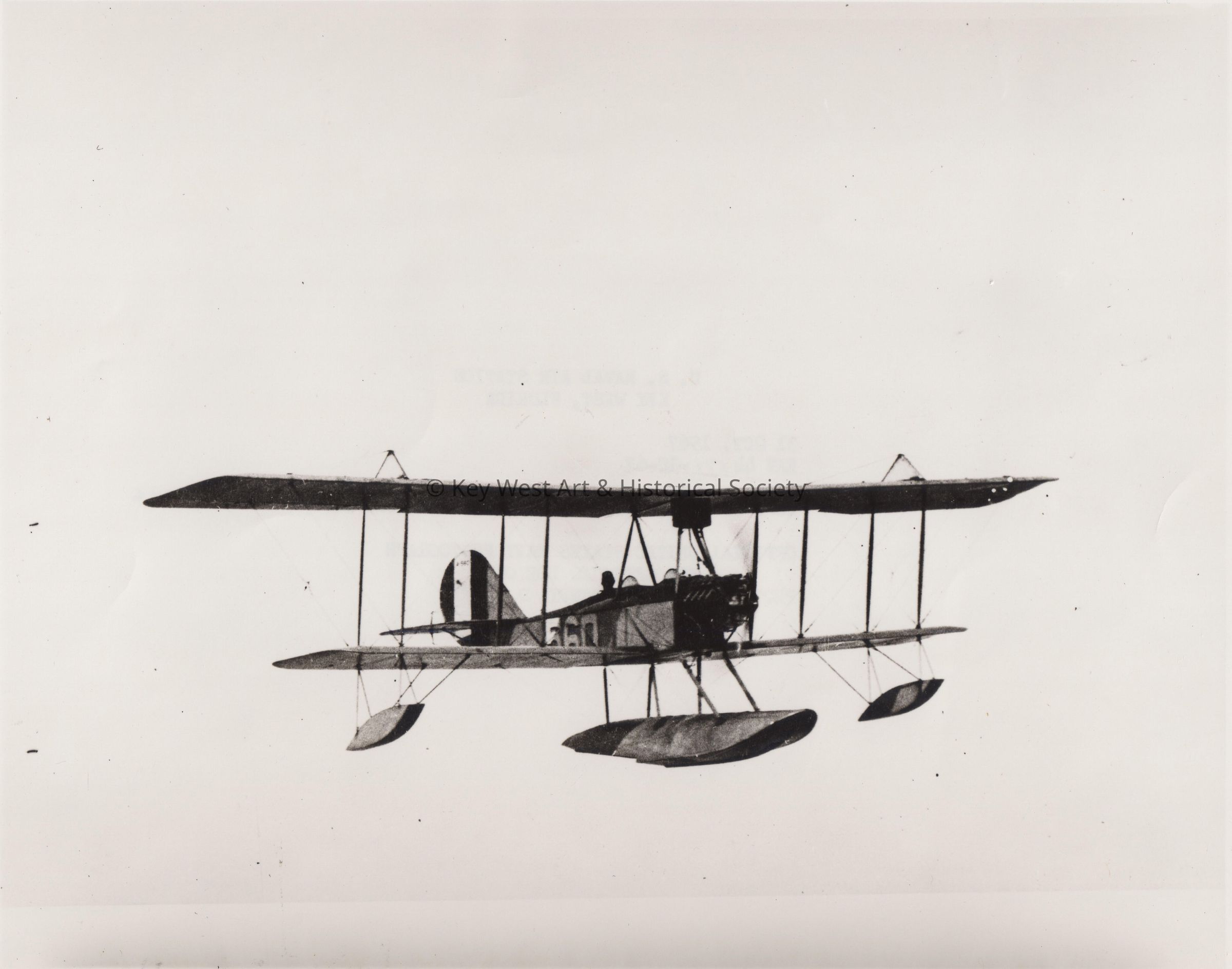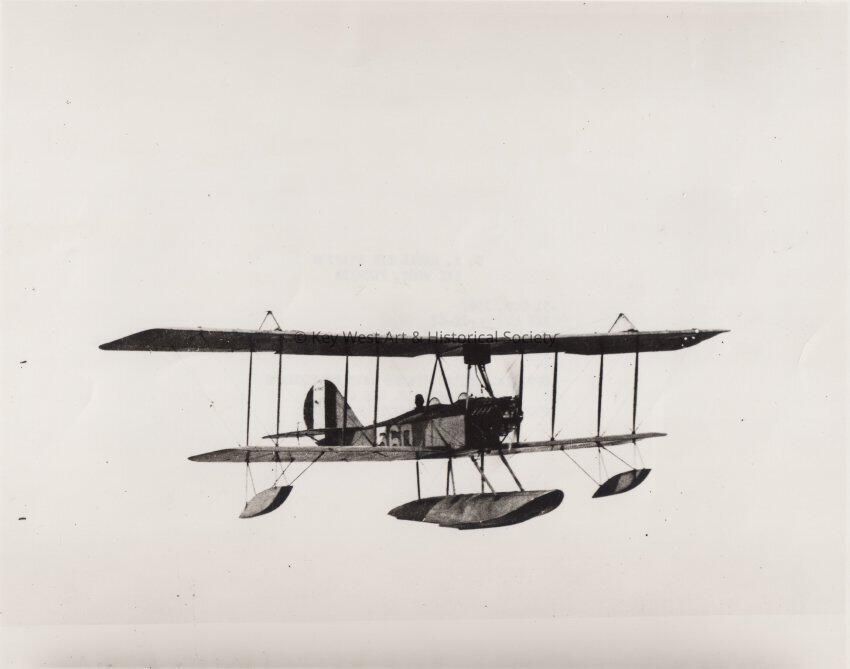 Black and white photograph of a seaplane in flight. The plane was based at the seaplane basin, Naval Air Station Key West.