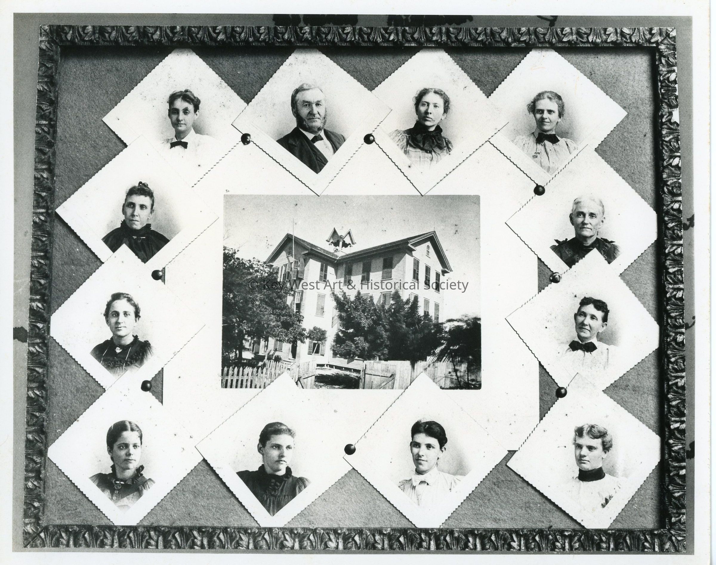 Black and white photograph of the Sears School faculty. The Sears School was the first public school in Key West, located on Free School Lane between Southard Street and Fleming Street. Pictured left to right starting with top left and moving clockwise, Miss Jennie Ryan (Mrs. Plummer), Professor B.C. Nichols, Miss Mary Dunn, Miss Louisa Lowe (died 1897), Mrs. Mary Givens, Mrs. Charlotte Gould, Miss Ellie Russell, Miss Bessie Roberts (Pinder), Miss Louise Sweeting (Mrs. Grant), Miss Lettie Melbourne (Mrs. Allen Cleare), Miss Laura Grillon, Mrs. Lula Lee.Photograph Details
