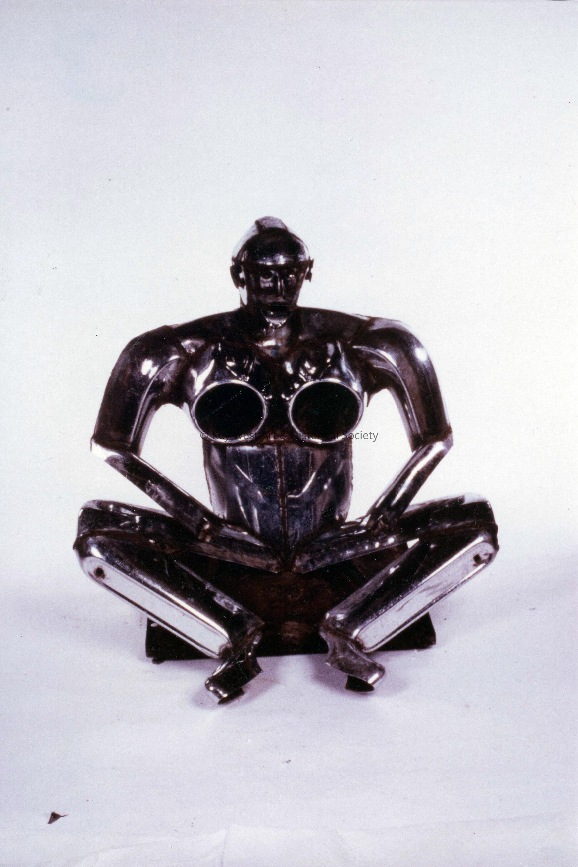 Freestanding sculpture by Stanley Papio depicting a seated figure. The figure is made from welded chrome-plated automobile parts. The sculpture base is unplated carbon steel.Type of Sculpture