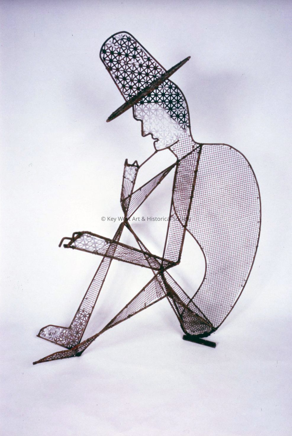 Freestanding sculpture by Stanley Papio depicting a seated male figure wearing a high crowned broad brimmed hat. The figure sits on the ground, elbows resting on bent knees, a finger of the right hand touching the chin. Fabricated from steel wire and steel mesh of two different types of fill.Type of Sculpture