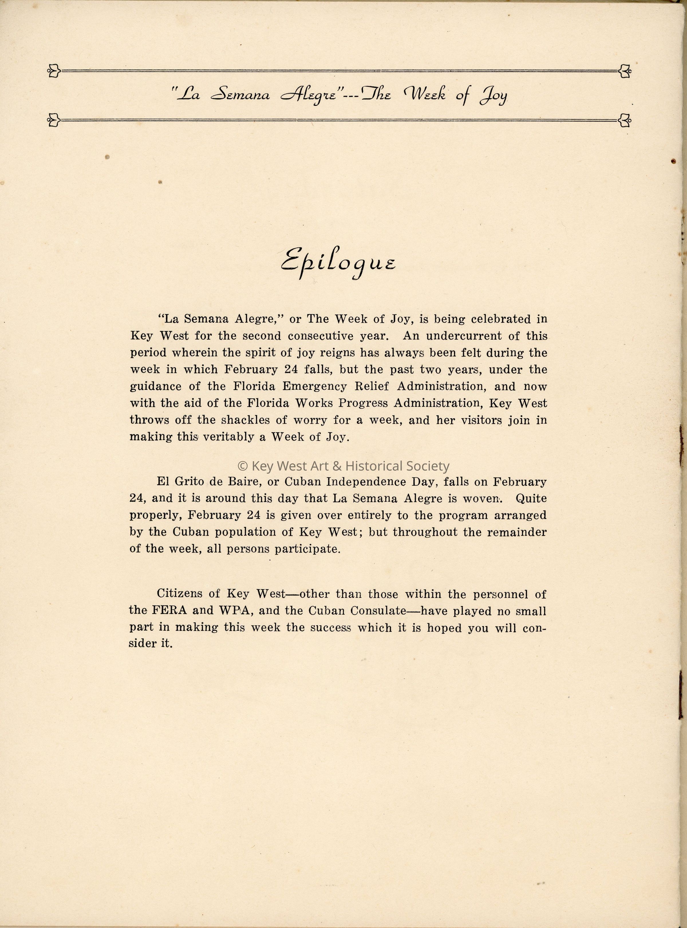 A program book for 'La Semana Alegre (The Week of Joy)' that took place from February 23-29, 1936 . The main performance was 'The Pirates of Penzance,' held at Fort Dillworth, Naval Station Key West.Collection